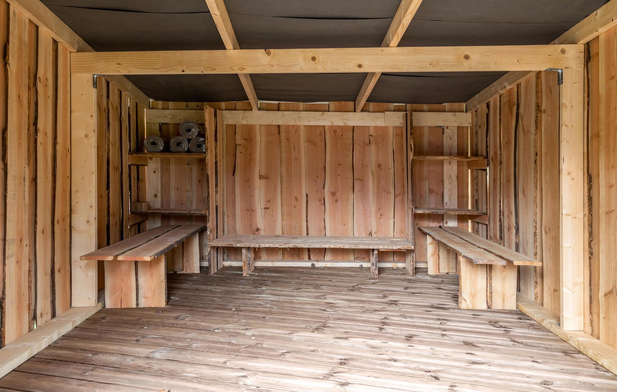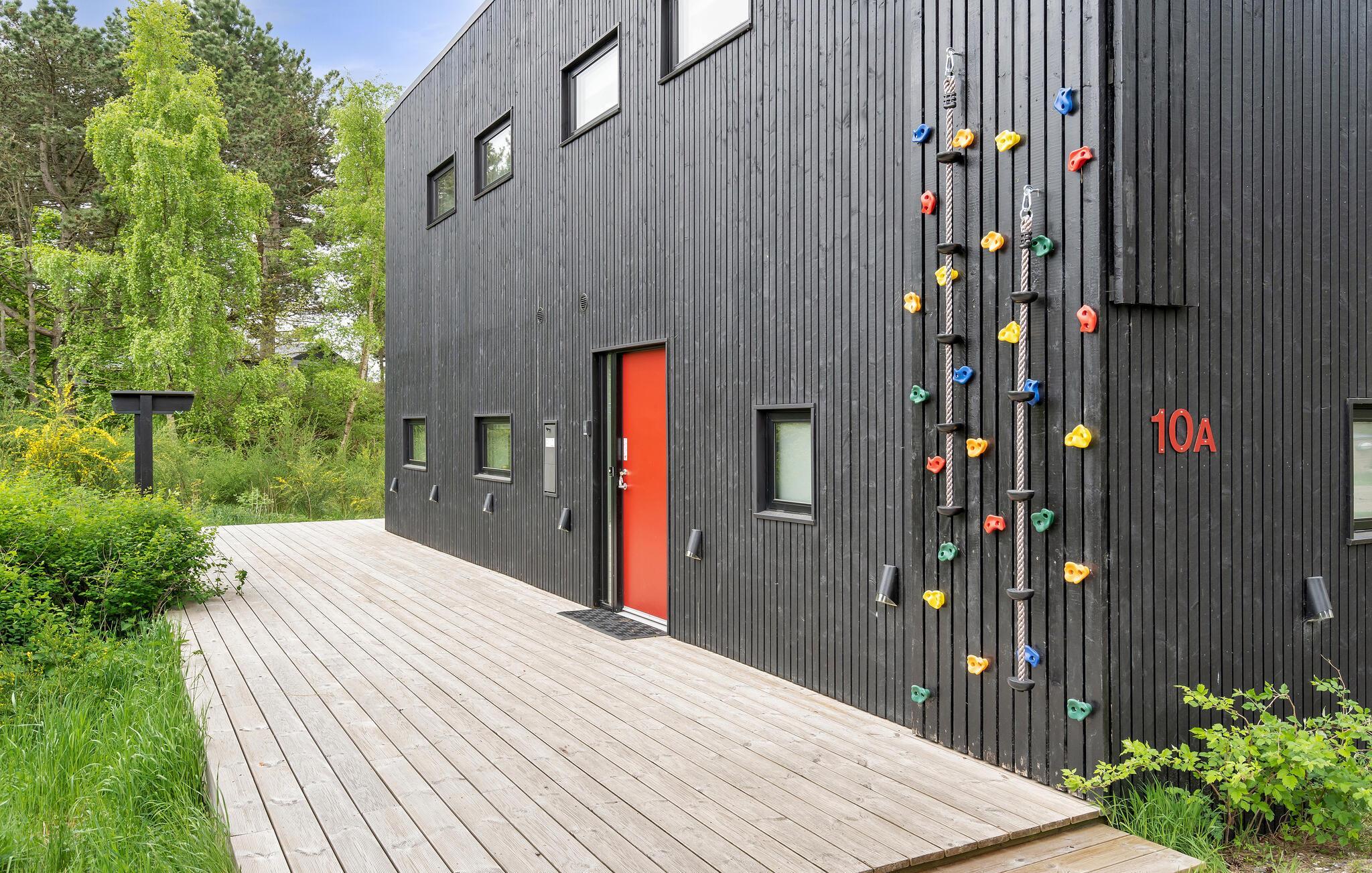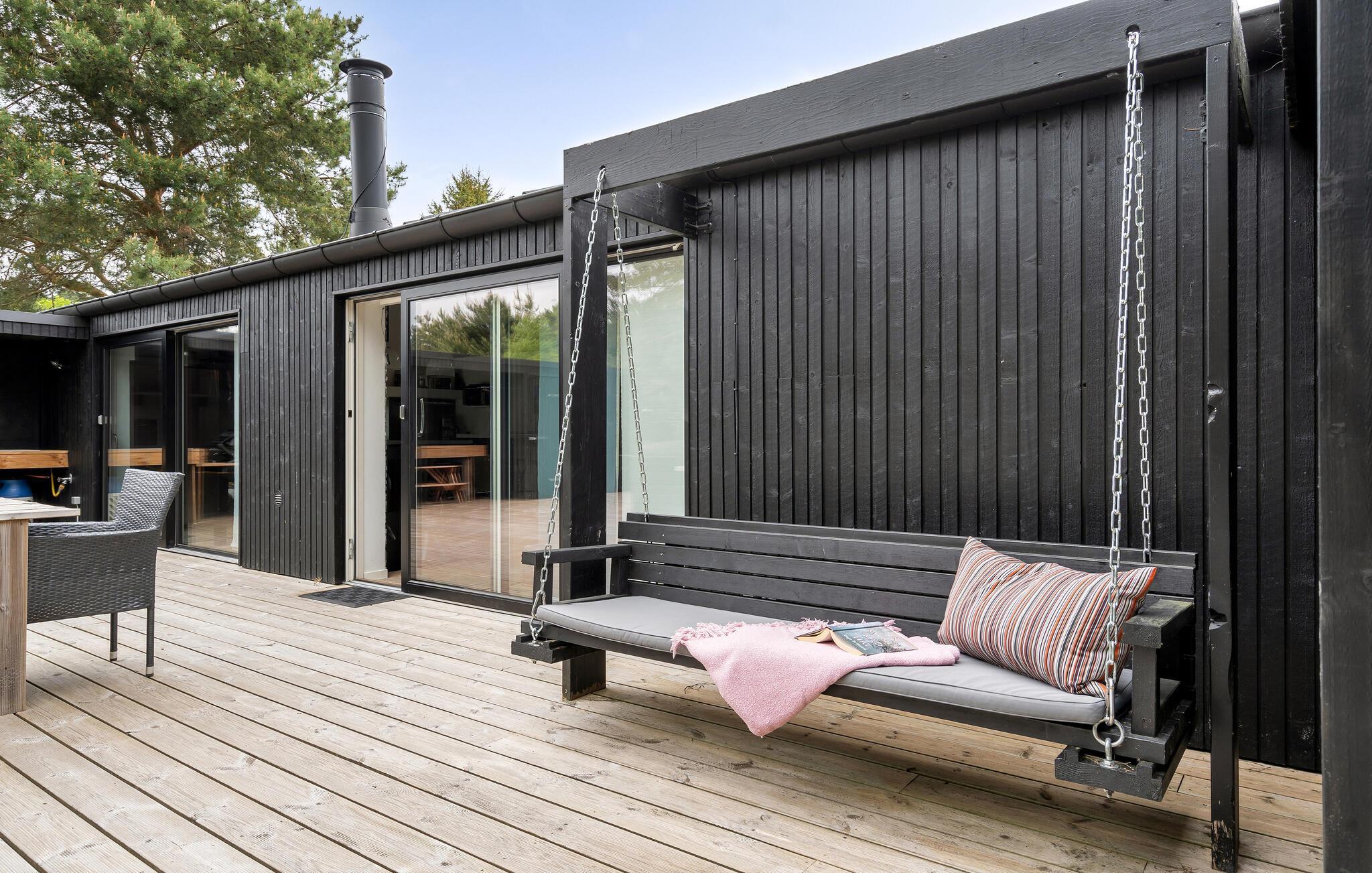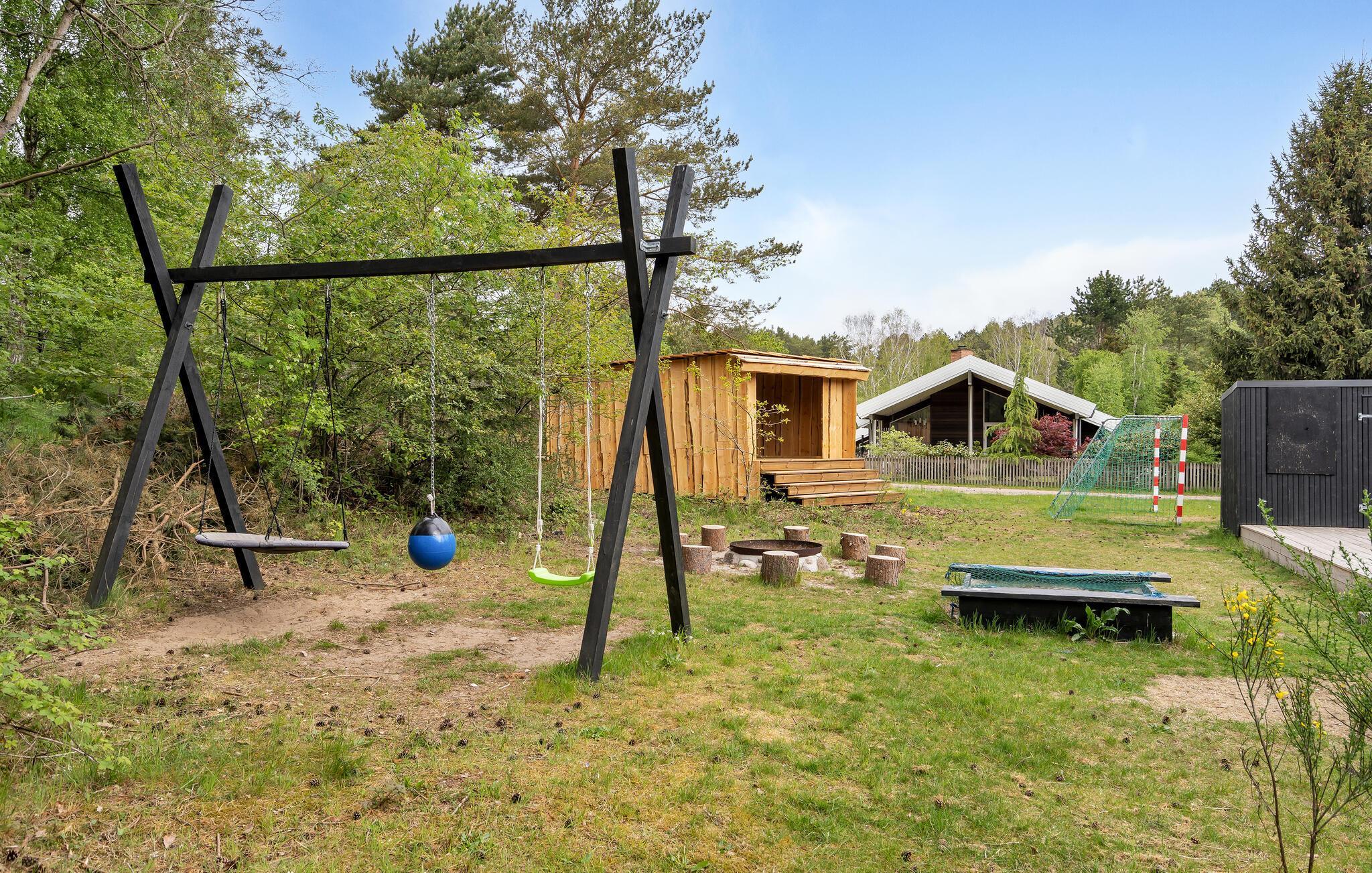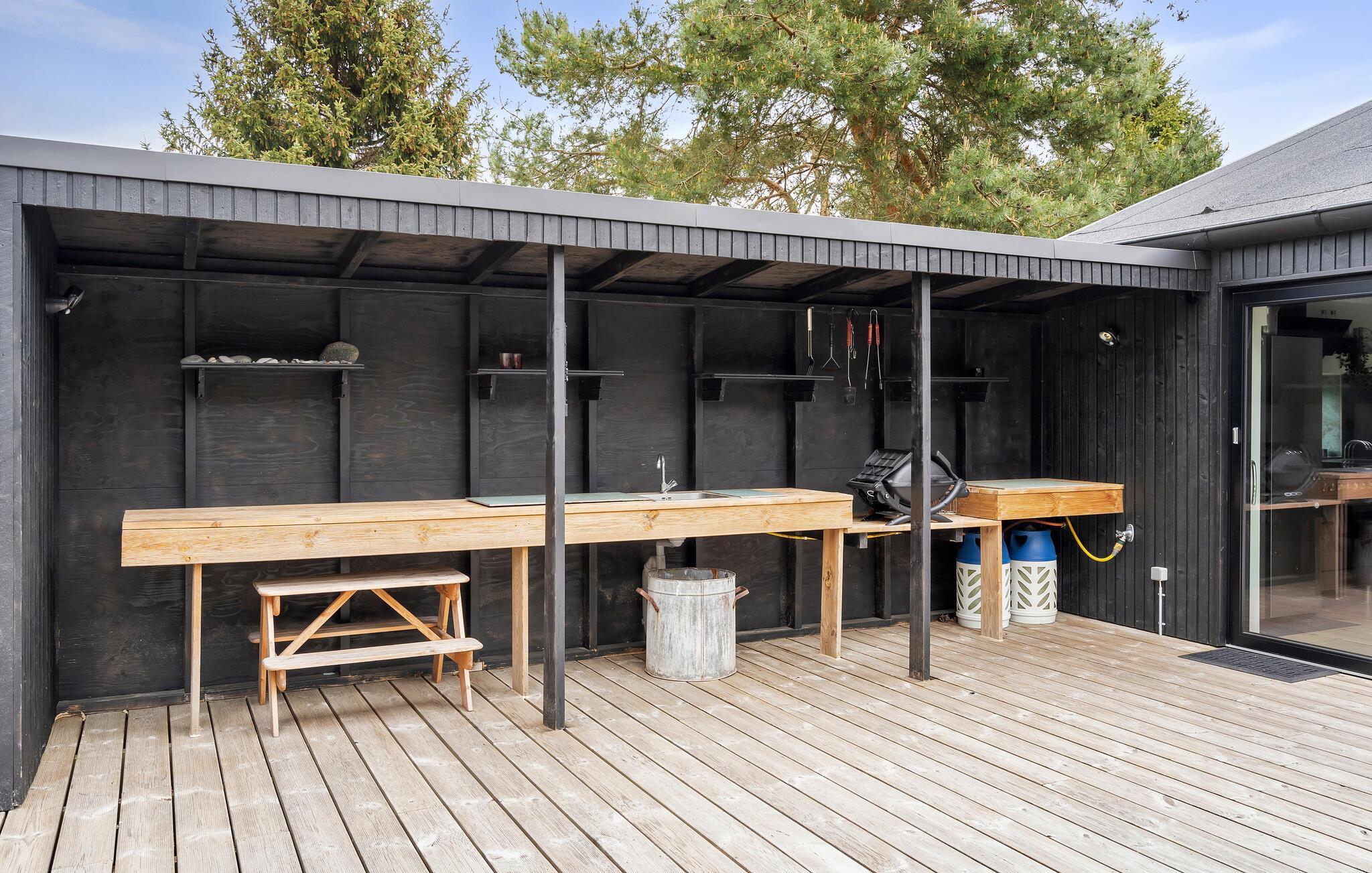 Fra stuen og spisepladsen er der udgang til det lækre terrasseområde, der ligger mellem huset og de to sidebygninger, der er bygget sammen med huset. Her kan I slappe af i havemøblerne, sidde i havegyngen, grille lækre feriemåltider, som I forbereder i det flotte udekøkken og bare nyde ferien. Børnene vil elske at lave snobrød og s'mores (kiks med skumfiduser) over bålstedet, der samtidig skaber hygge om aftenen. Der er også mulighed for at overnatte i det fri i shelteret. Der er i det hele taget lagt op til mange timers sjov, for på grunden findes også flere legeredskaber, et håndboldmål og en klatrevæg på gavlen, så børnene kommer ikke til at kede sig, mens I sidder og hygger jer. Får de yngste alligevel tid til at sidde stille, er der lavet et rundt havebord i en hyggekrog, hvor børnene kan holde picnic.