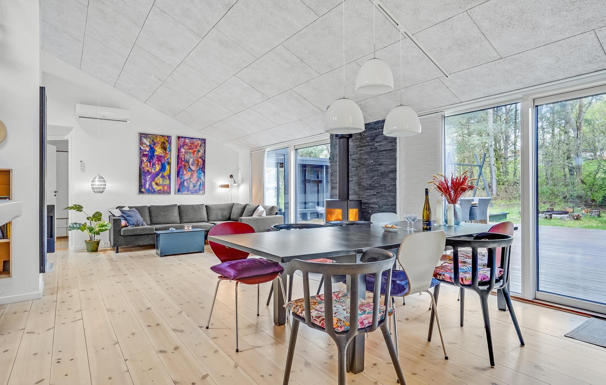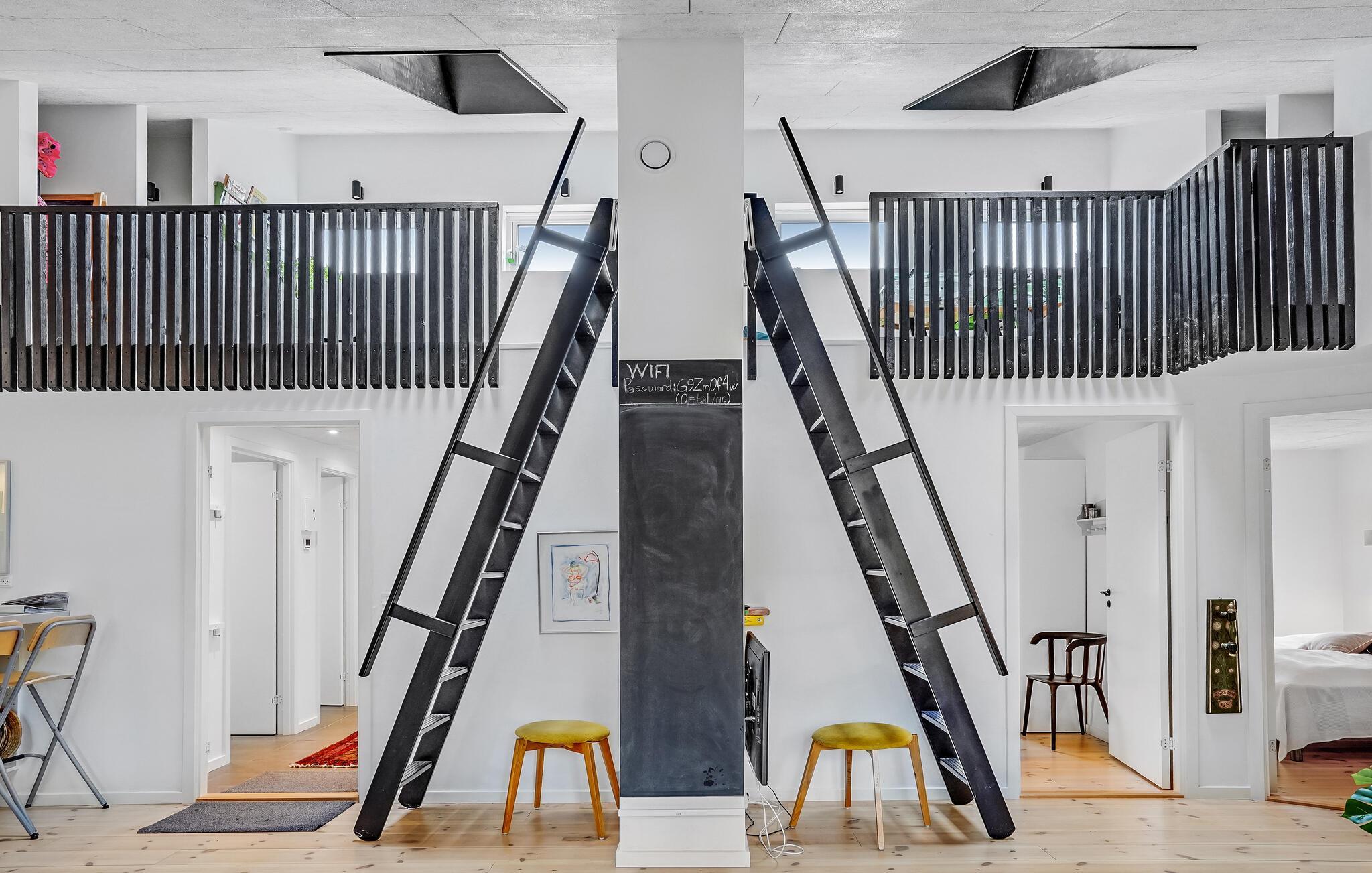 Huset er spændende indrettet, pænt møbleret, og der er kræset for detaljerne. Brændeovnen er placeret således, at I kan nyde varmen både i stuen og i køkkenområdet. De 2 store hemse har fuld ståhøjde og er bestemt et aktiv til de større børn, hvor de vil elske at overnatte i de to "huleagtige" rum (adgang sker via en stige med gelænder).