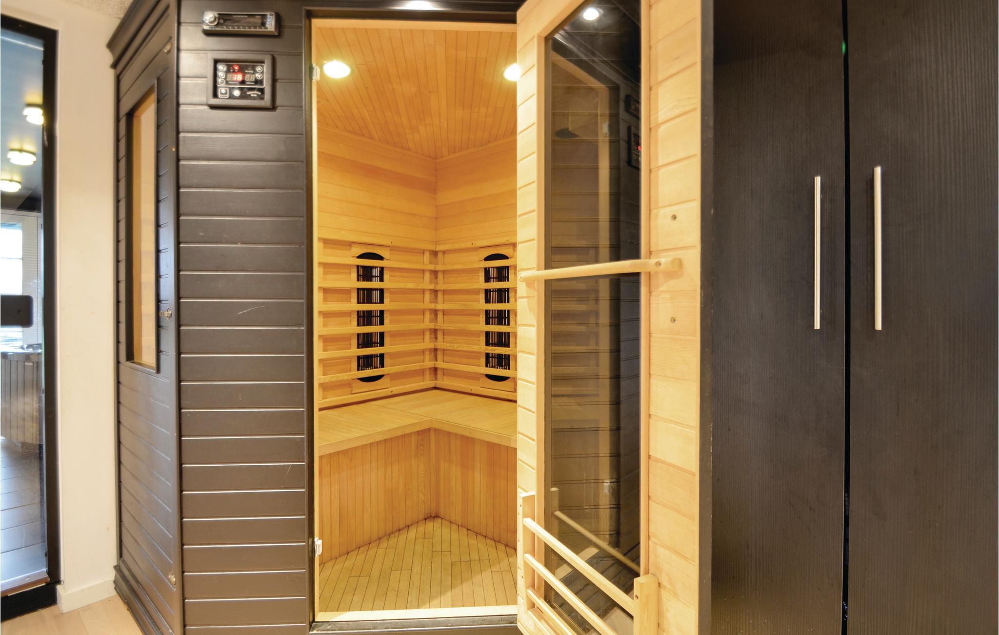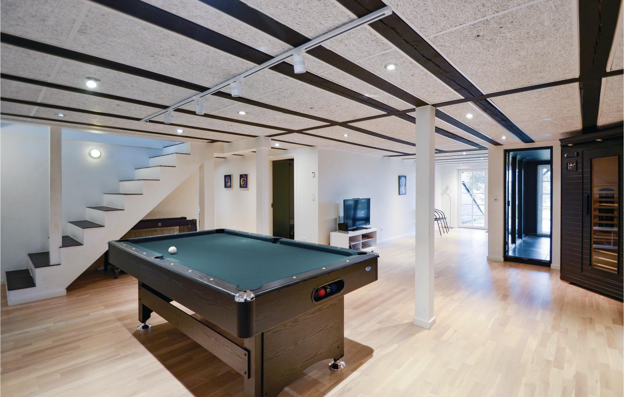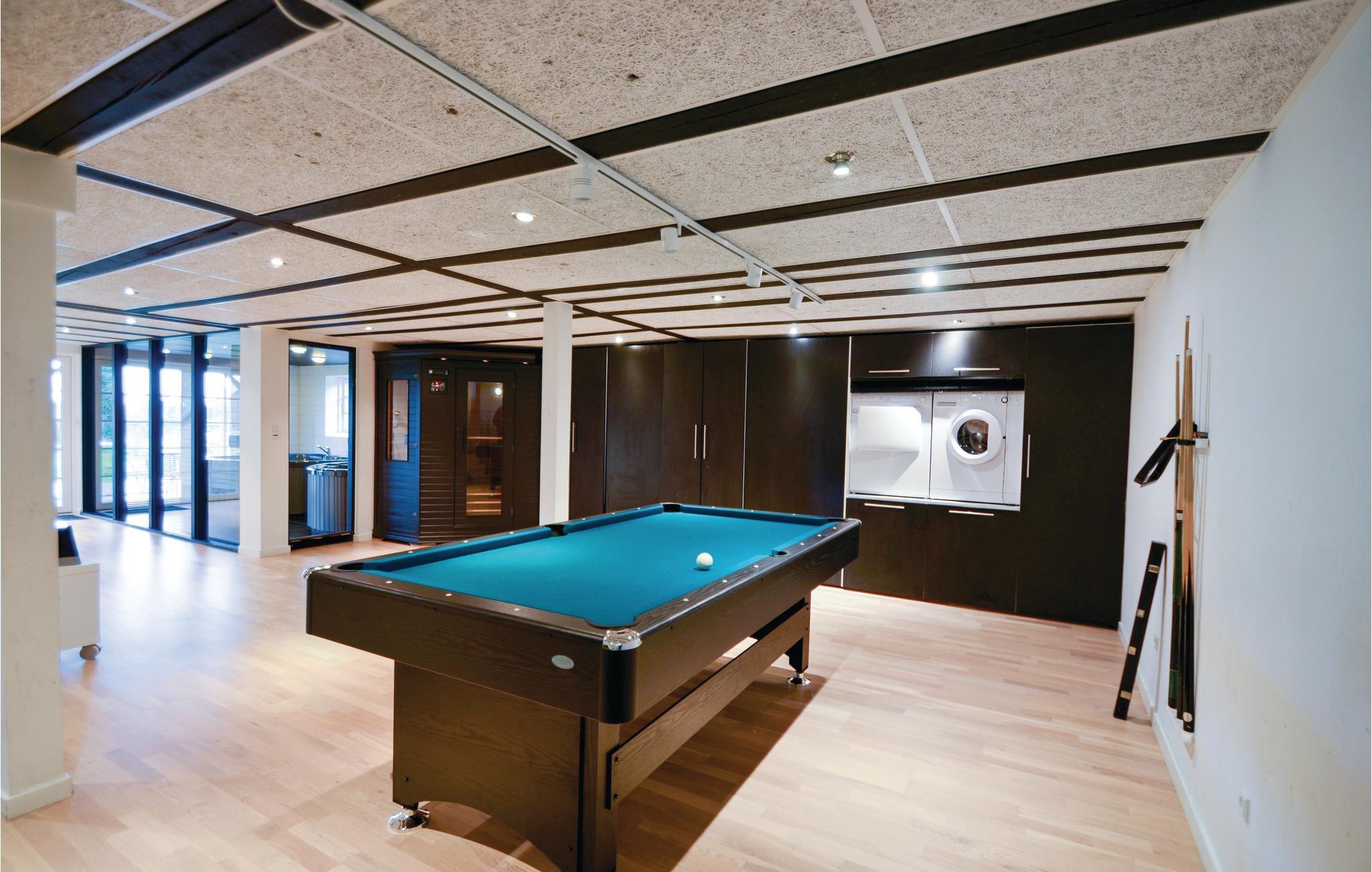 Huset har fritlagte bjælker overalt, er fyldt med atmosfære og indeholder bl.a. et moderne og veludstyret køkken med bl.a. to køle-/fryseskabe og to indbygningsovne, en dejlig stue, gode soverum, spabad, infrarød sauna, et stort aktivitetsrum. Her er en ekstra fladskærm til spil og film og alle muligheder for et skønt ferieophold, uanset om I vil være aktive eller bare slappe af og nyde ferien.