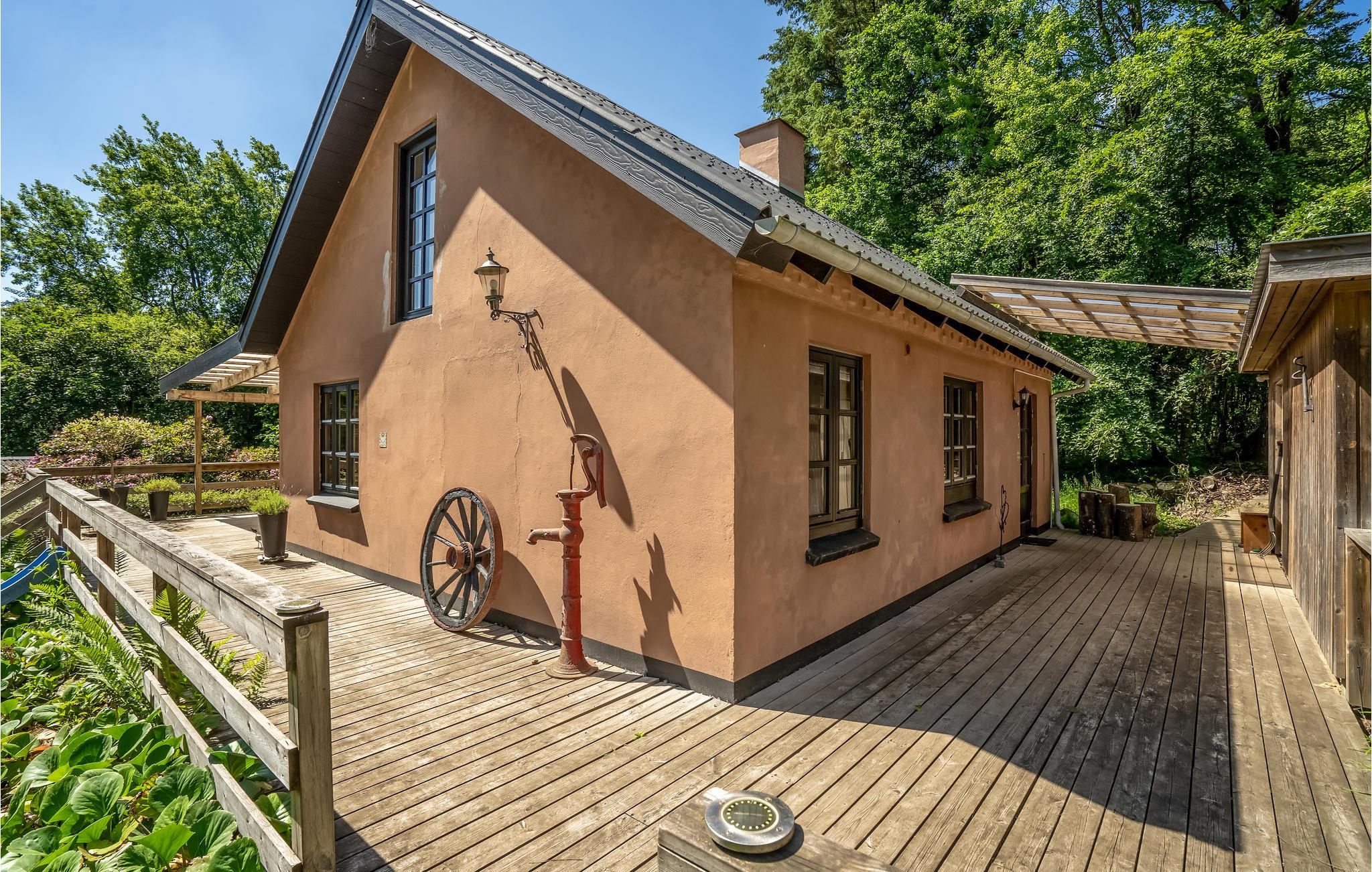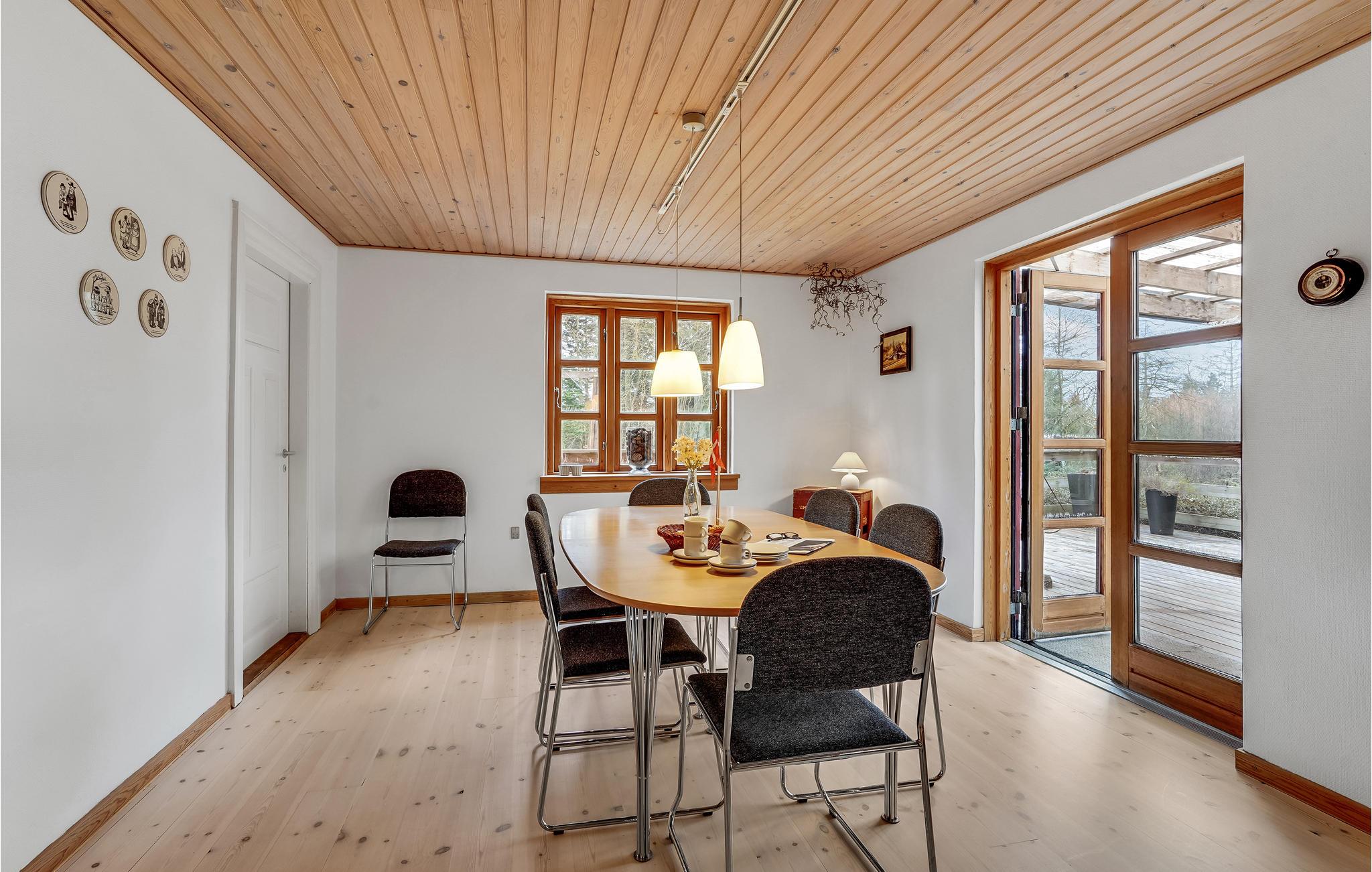 Velkommen på denne fredfyldte grund, hvor denne hyggelige ferievilla ligger placeret. Her kan I se frem til en hyggelig ramme om de rolige stunder, når I vender hjem fra dagens eventyr. Nyd dagens måltider rundt om det lange spisebord og læn jer senere godt tilbage i sofahjørnet, mens ilden knitrer stemningsfuldt i pilleovnen, som skaber en behagelig atmosfære på de kølige aftener.