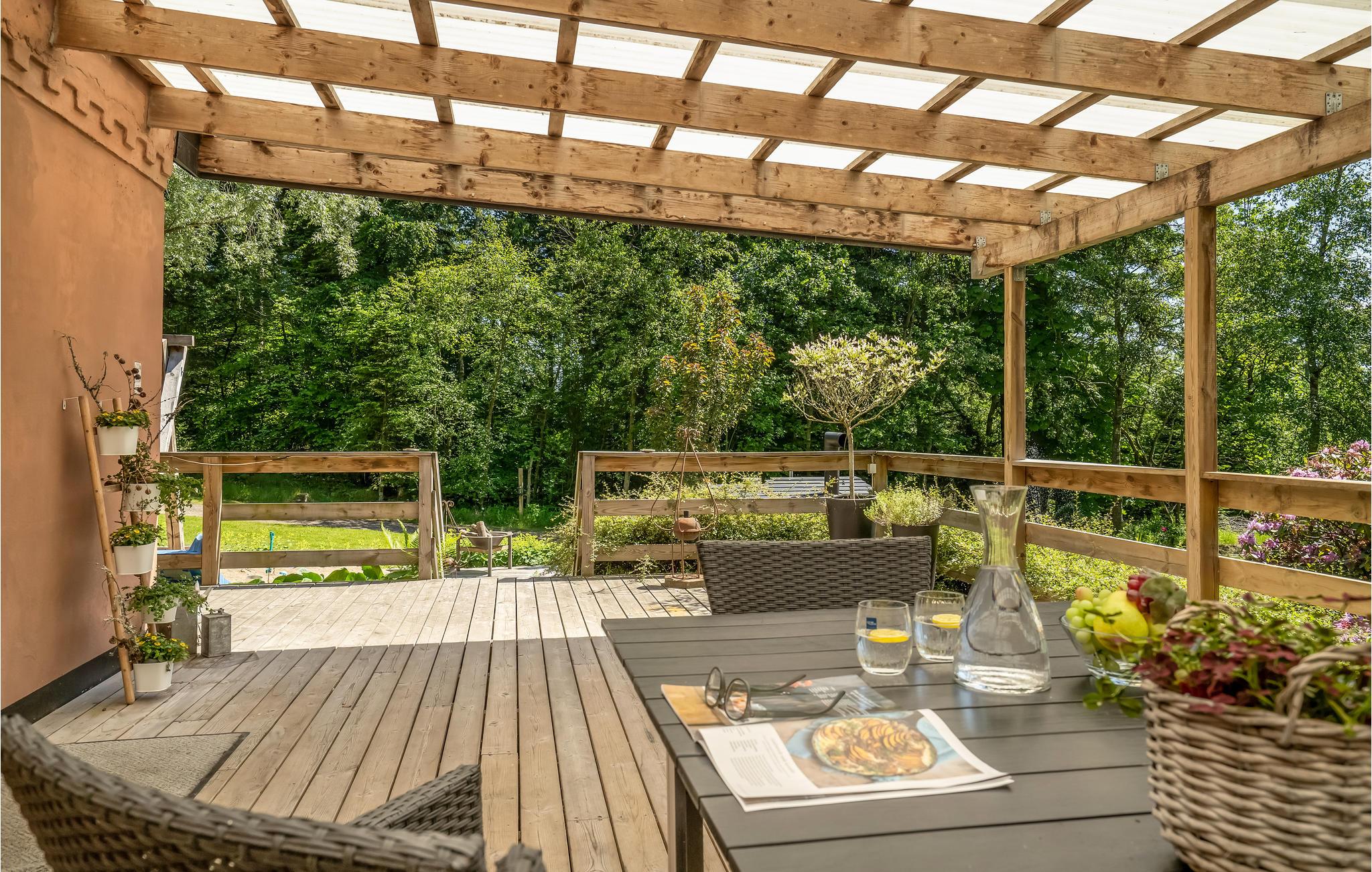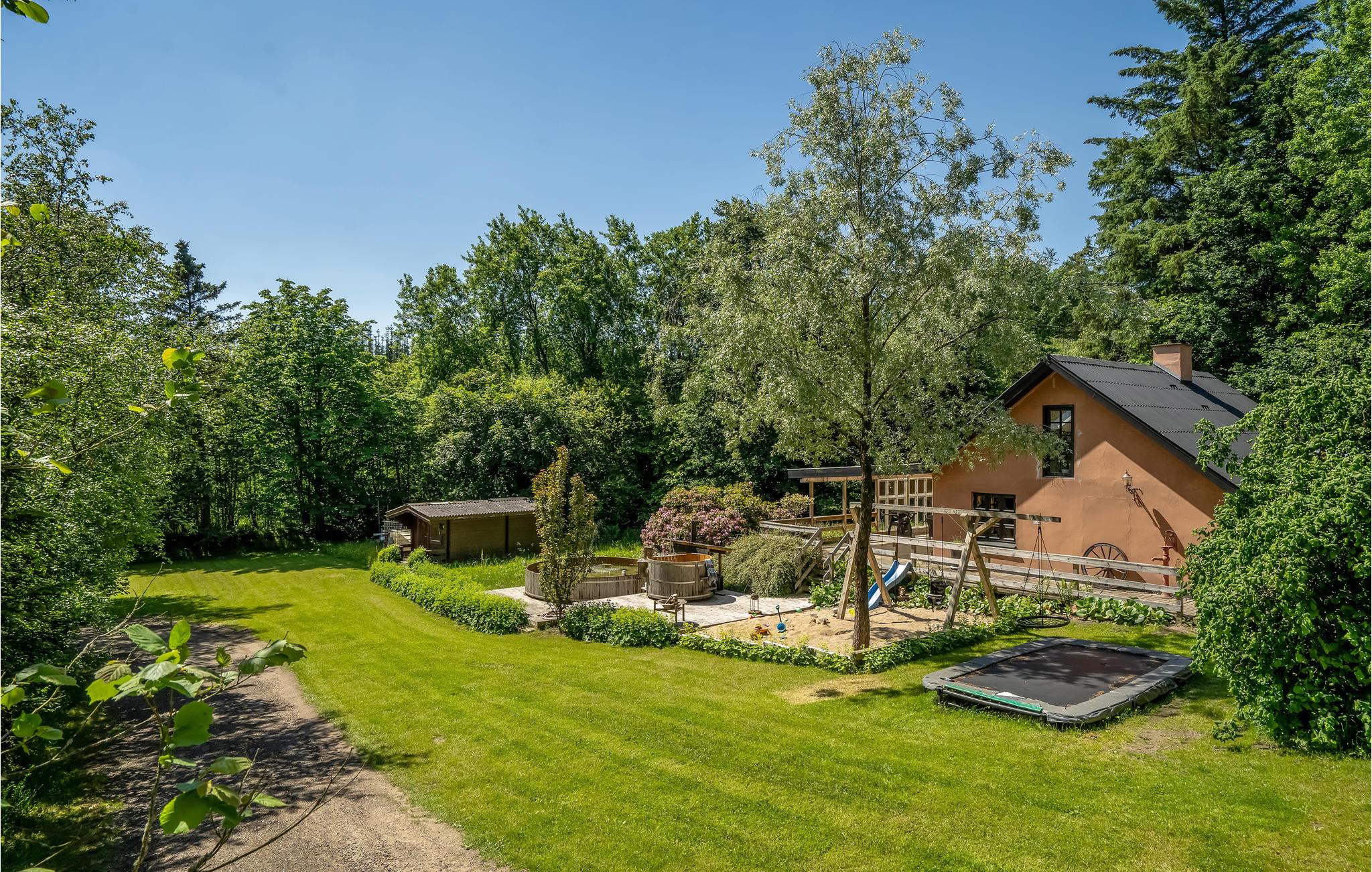 Haven er en skøn oase med mange områder og velordnede bede, så her kan I virkelig nyde alle solskinstimerne. Sæt jer med en kold forfriskning, mens børnene leger på legestativerne og trampolinen. Hvis I vil gøre noget godt for jer selv, kan I sætte jer godt til rette i vildmarksbadet efter en lang dag på farten, og måske er I så heldige, at hjortene lægger vejen forbi ved daggry eller skumringstid. Vildmarksbadet opvarmes med diesel, som kan tilkøbes i huset.