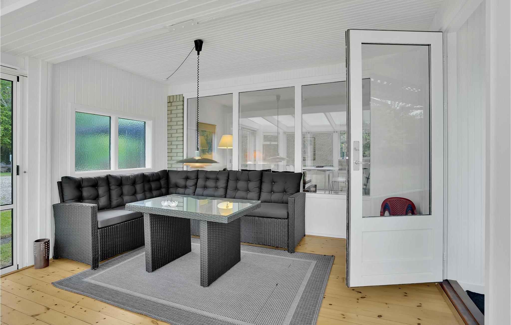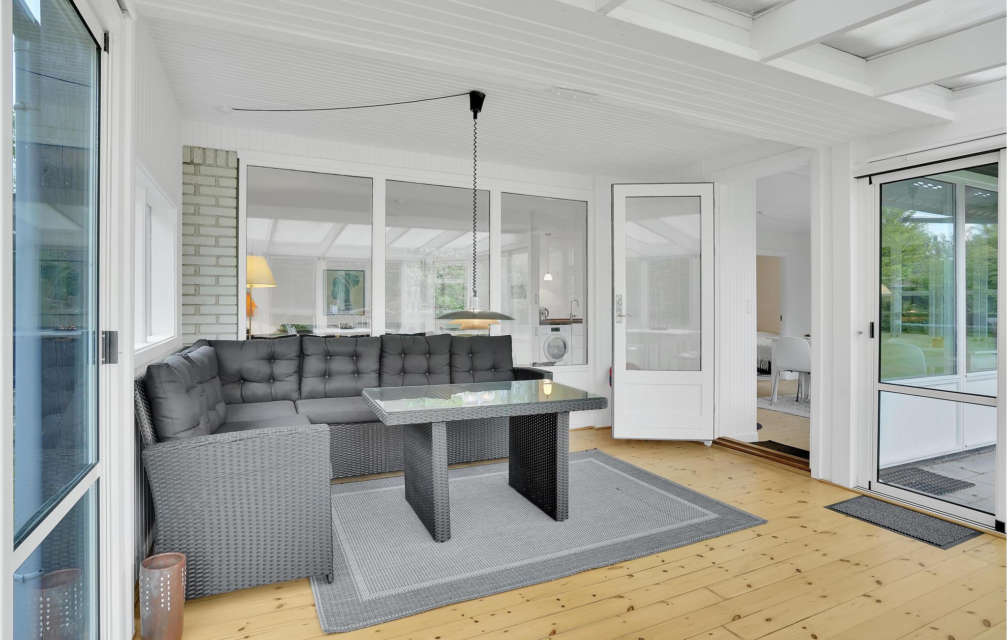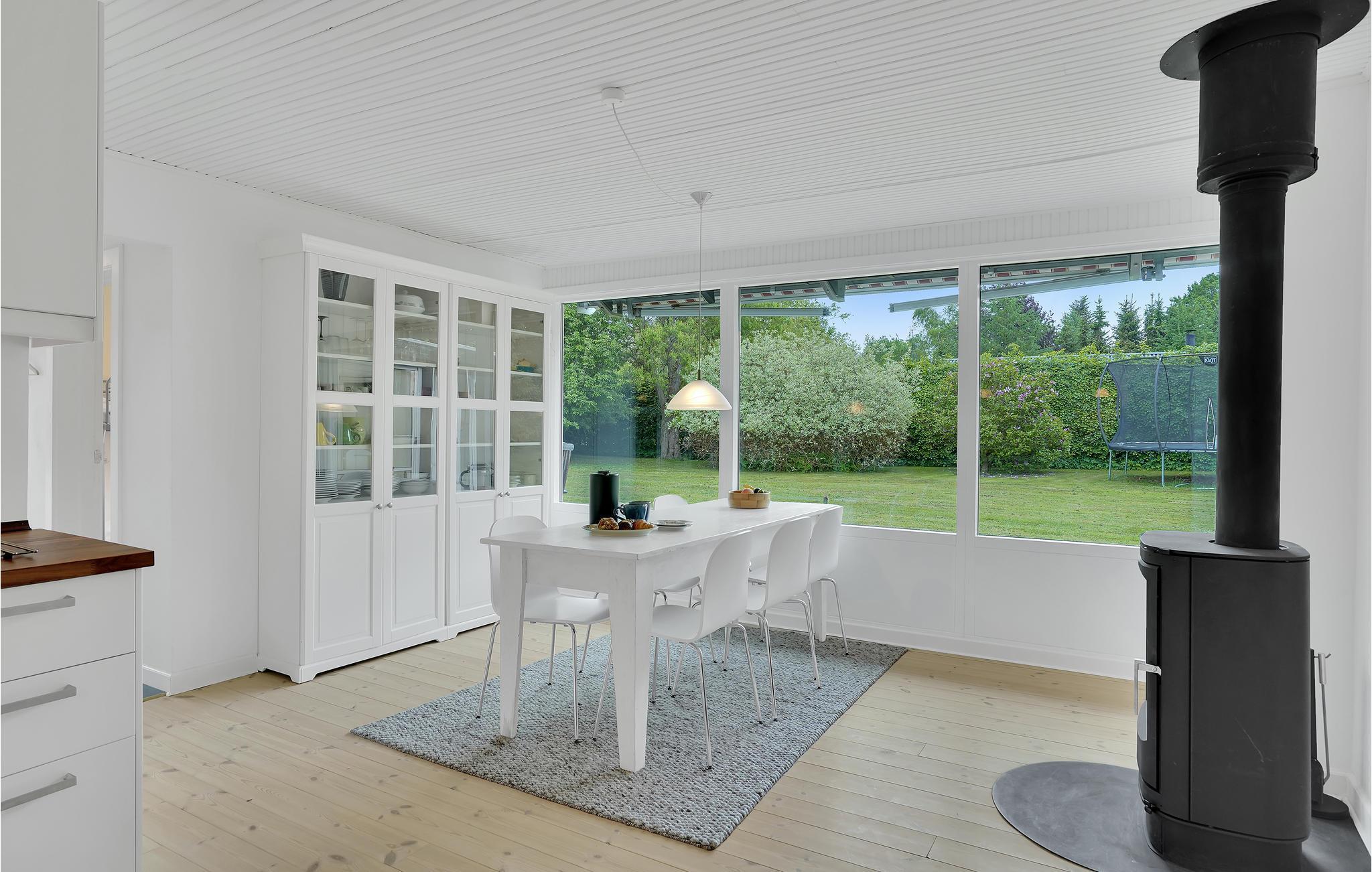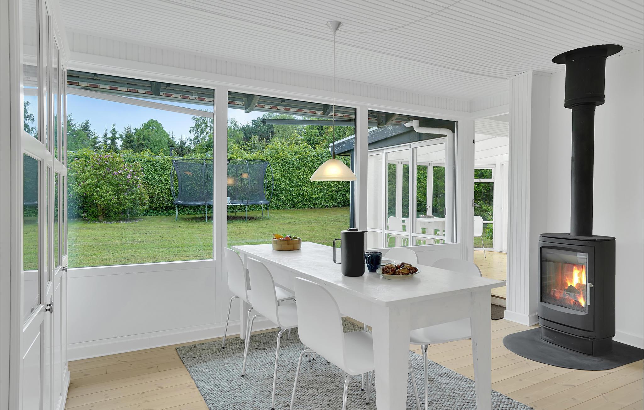 Tag familien med til dette harmoniske sommerhus, som har en stor have og ligger tæt på en dejlig strand. Huset skal især fremhæves for en dejlig udestue, hvor I får følelsen af at sidde udendørs og kan nyde lyset og de grønne omgivelser uanset vejret. Om aftenen bidrager brændeovnen med hyggelig varme. Lyt til ildens knitren, mens I samles om skønne måltider eller slapper af med en spilleaften.