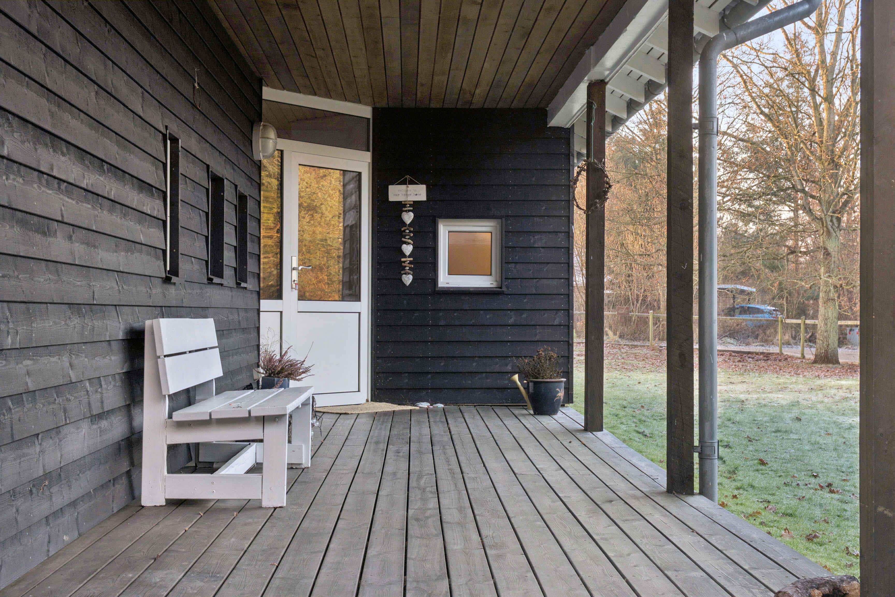 Hyggeligt sort træsommerhus tæt på Korevlernes strand med stor terrasse og indhegnet have i Odsherred.