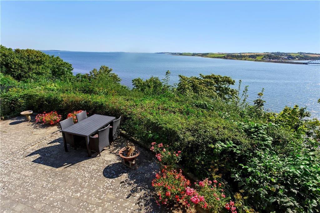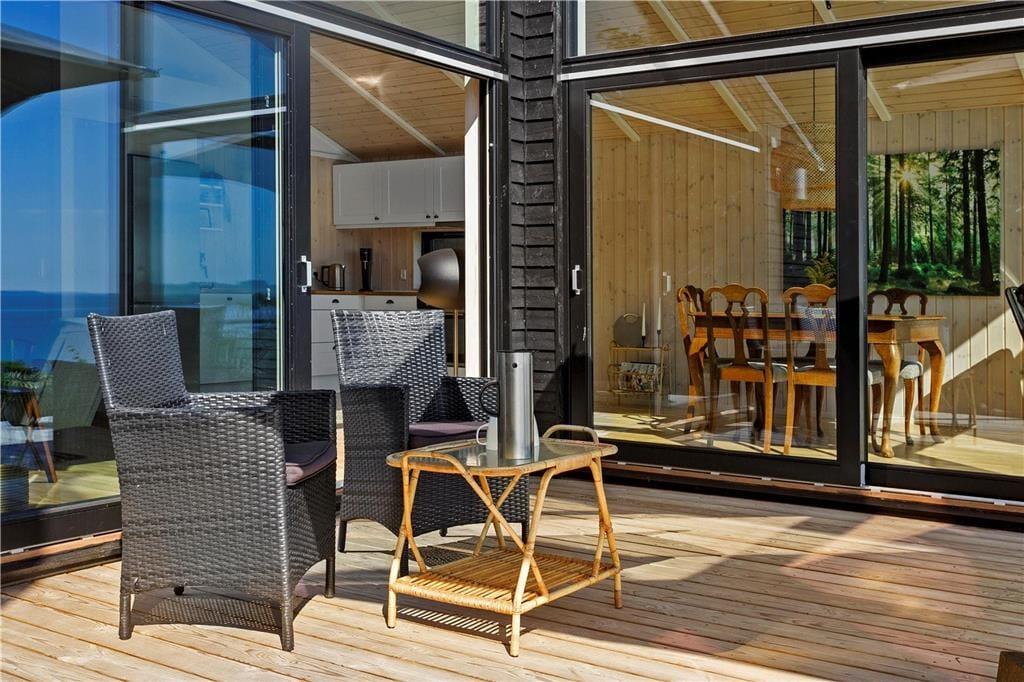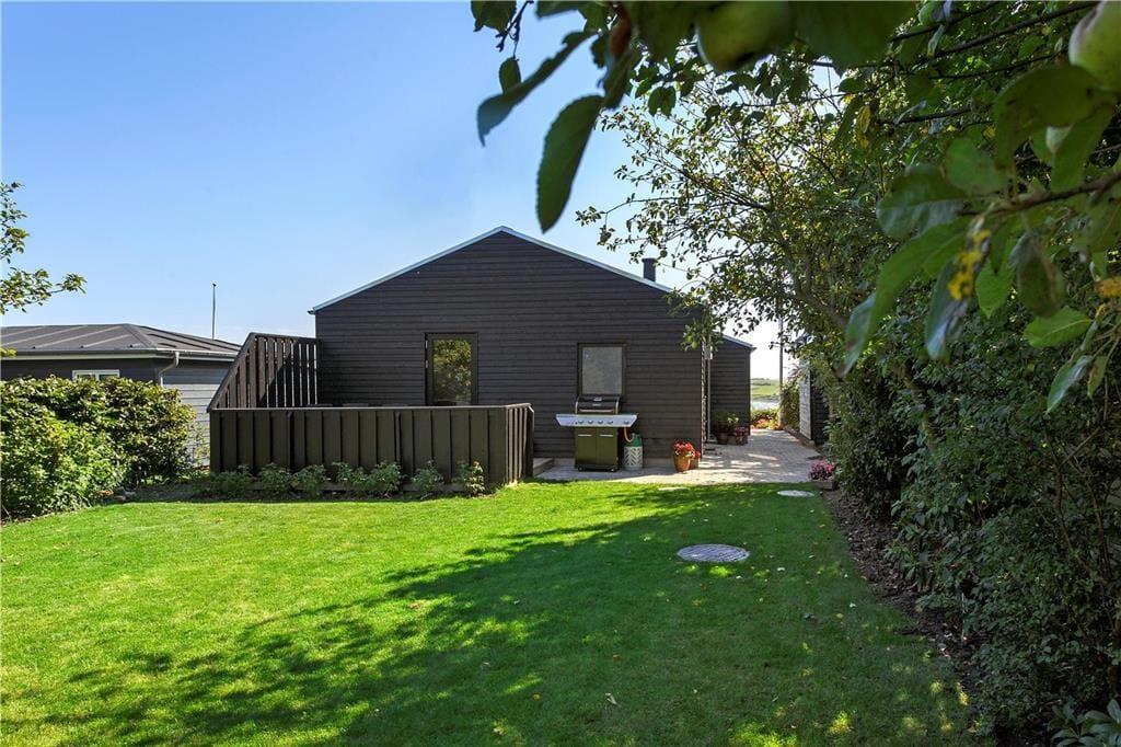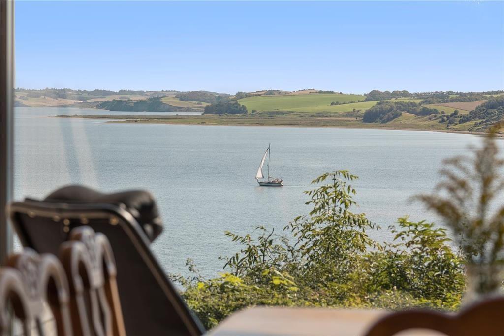 De skønne terrasser er uden tvivl en af de helt store kvaliteter ved dette hus. Foran huset er der en mindre vestvendt terrasse og mod syd et dejligt udendørs køkken. Mod vandsiden (sydøst) er der to store, solrige terrasser. Her kan I dase i liggestole og nyde den helt forrygende udsigt over Limfjorden mod øen Mors.
