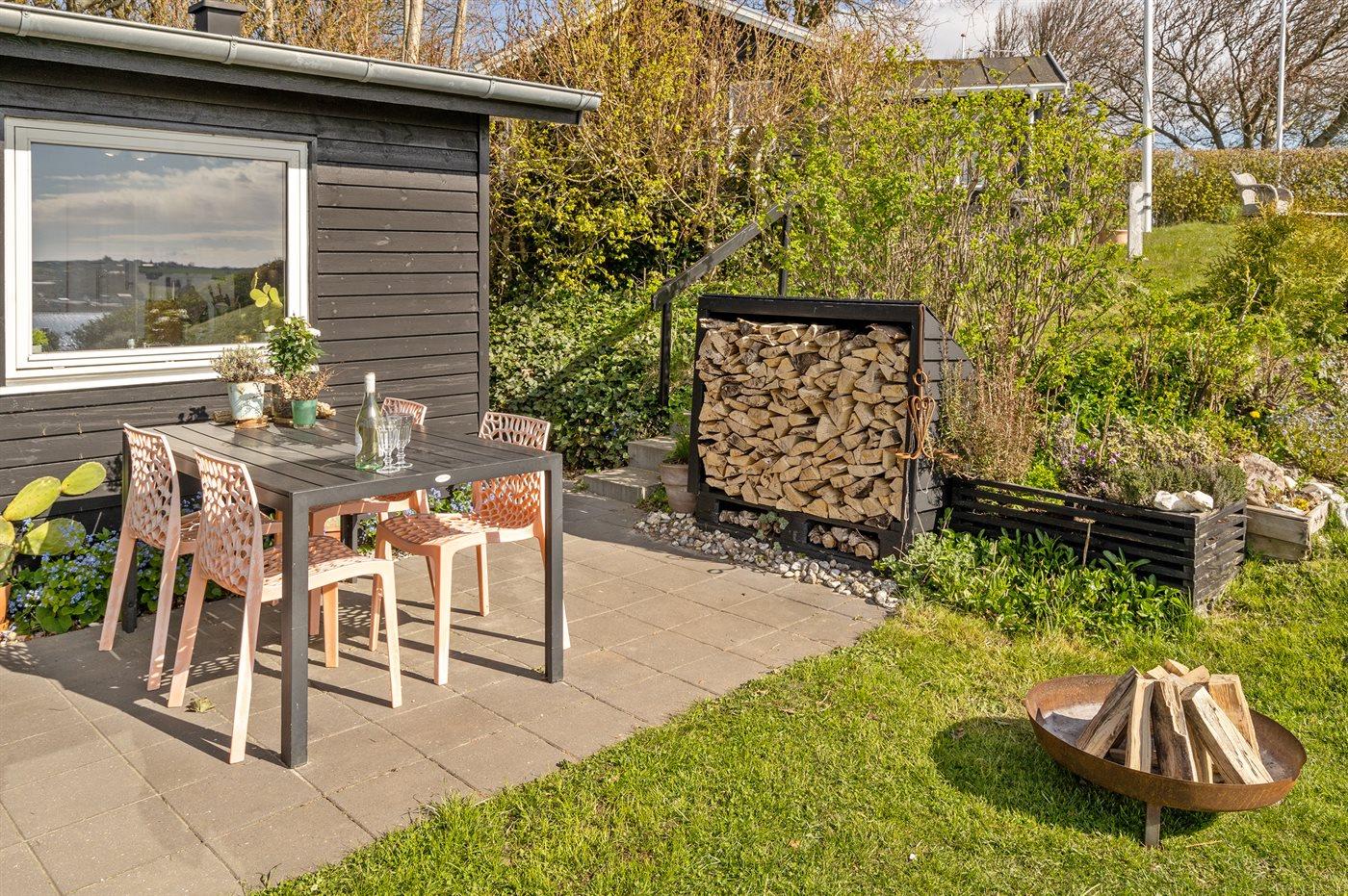 1.Terrassen, der med sin overdækning, læ for vestenvinden, infrarøde varmelampe og mobile persienne fungerer som et naturligt samlingssted.