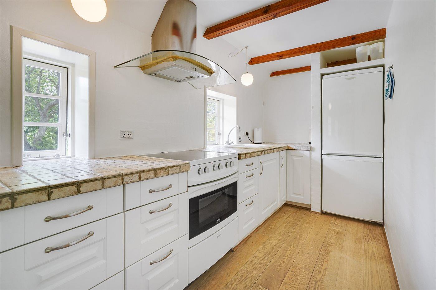 Køkkenet er udstyret med 1 køleskab. Der er 4 keramiske kogeplader, varmluftovn, mikrobølgeovn.