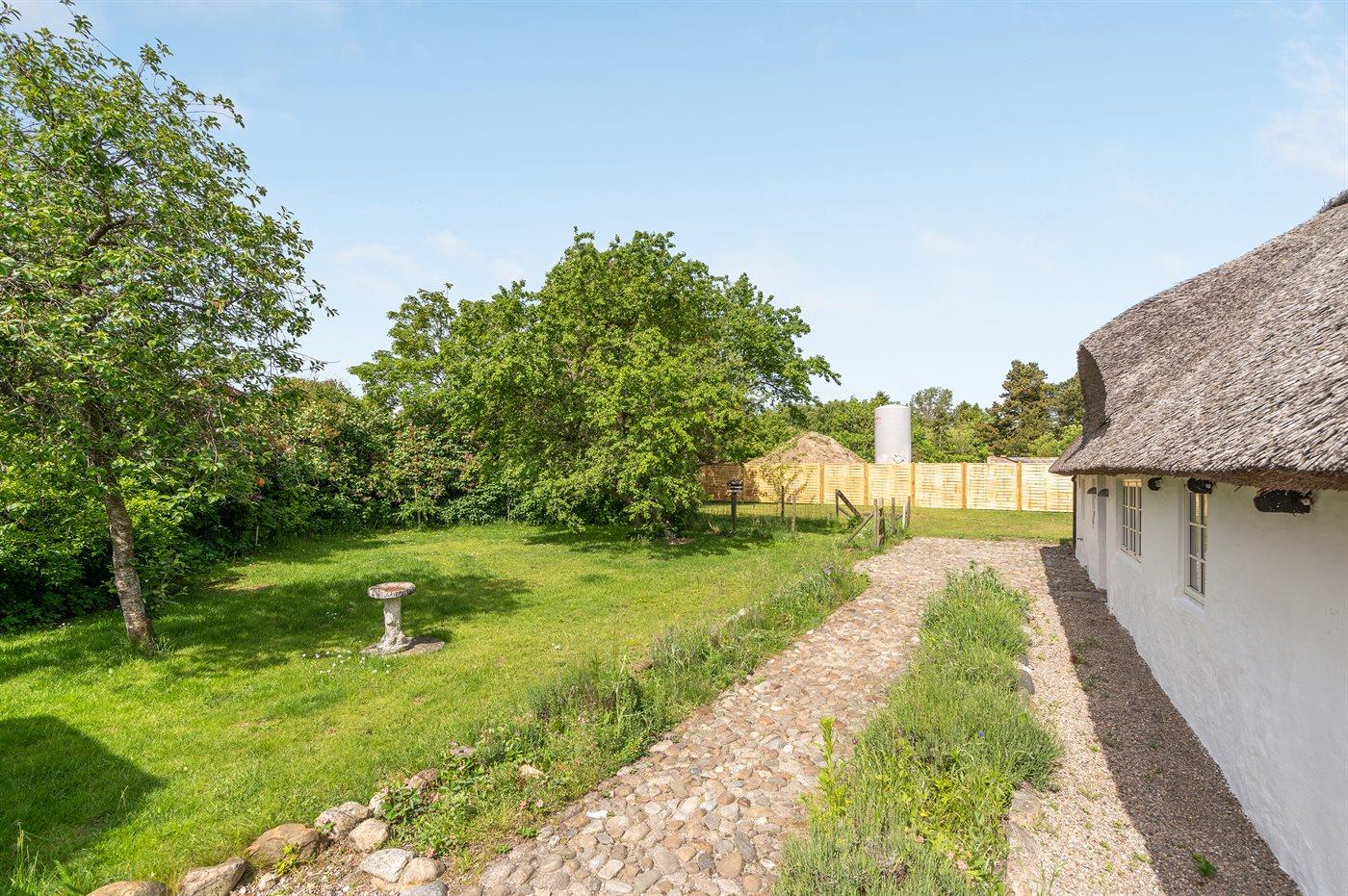 Charmerende stråtækt bindingsværkshus i Voerså med tæt adgang til natur og hav, perfekt til familie og kæledyr.