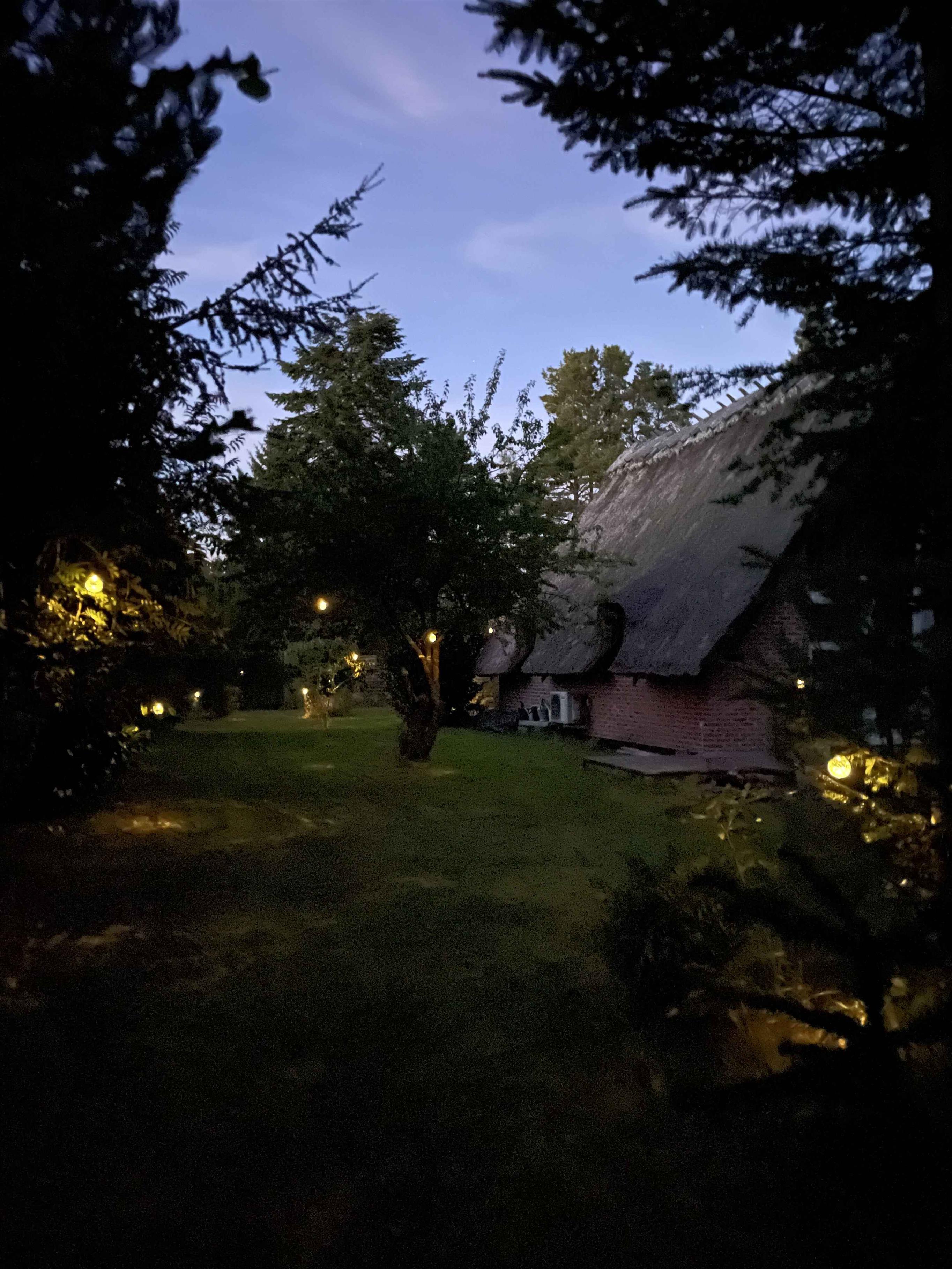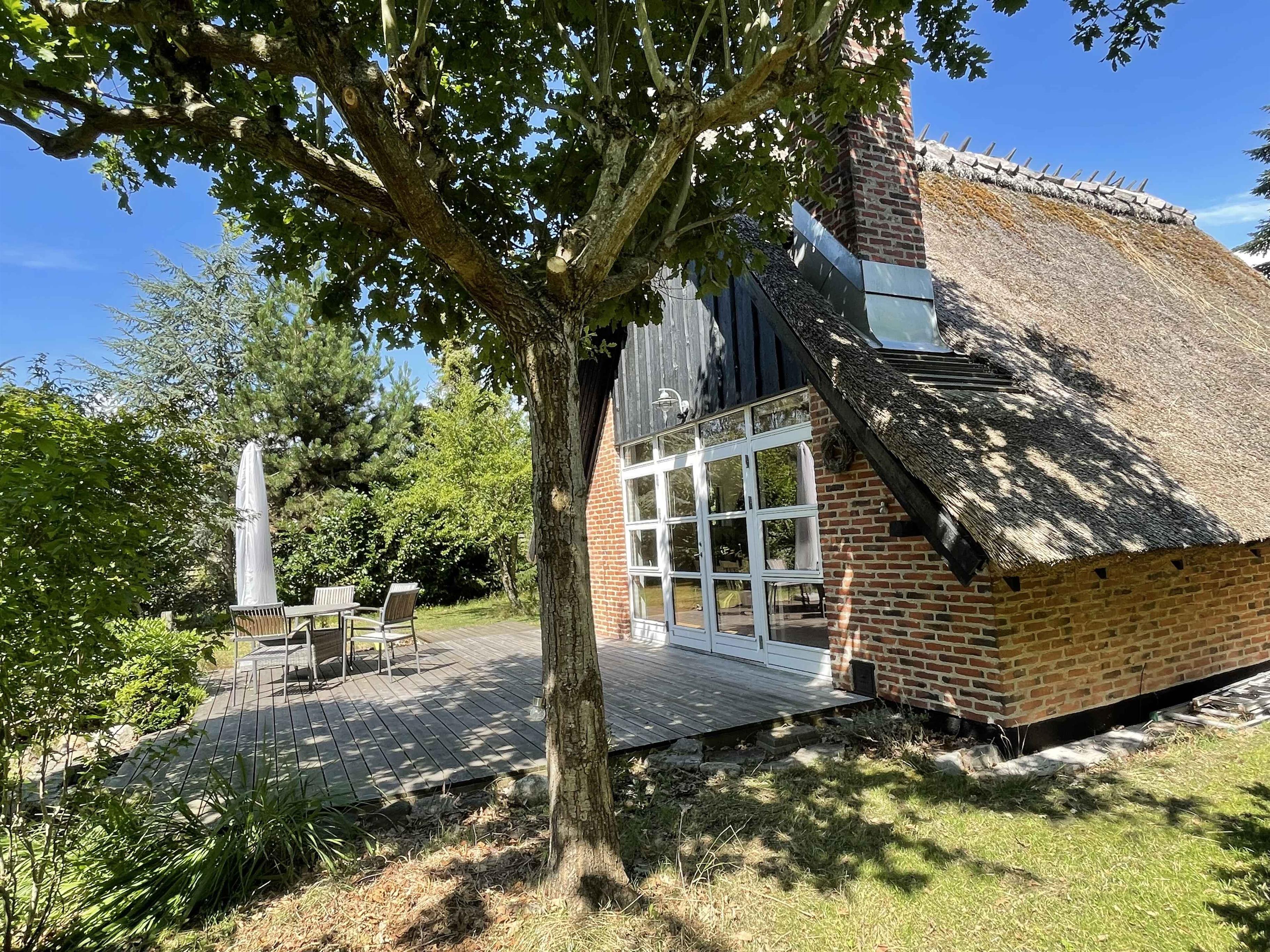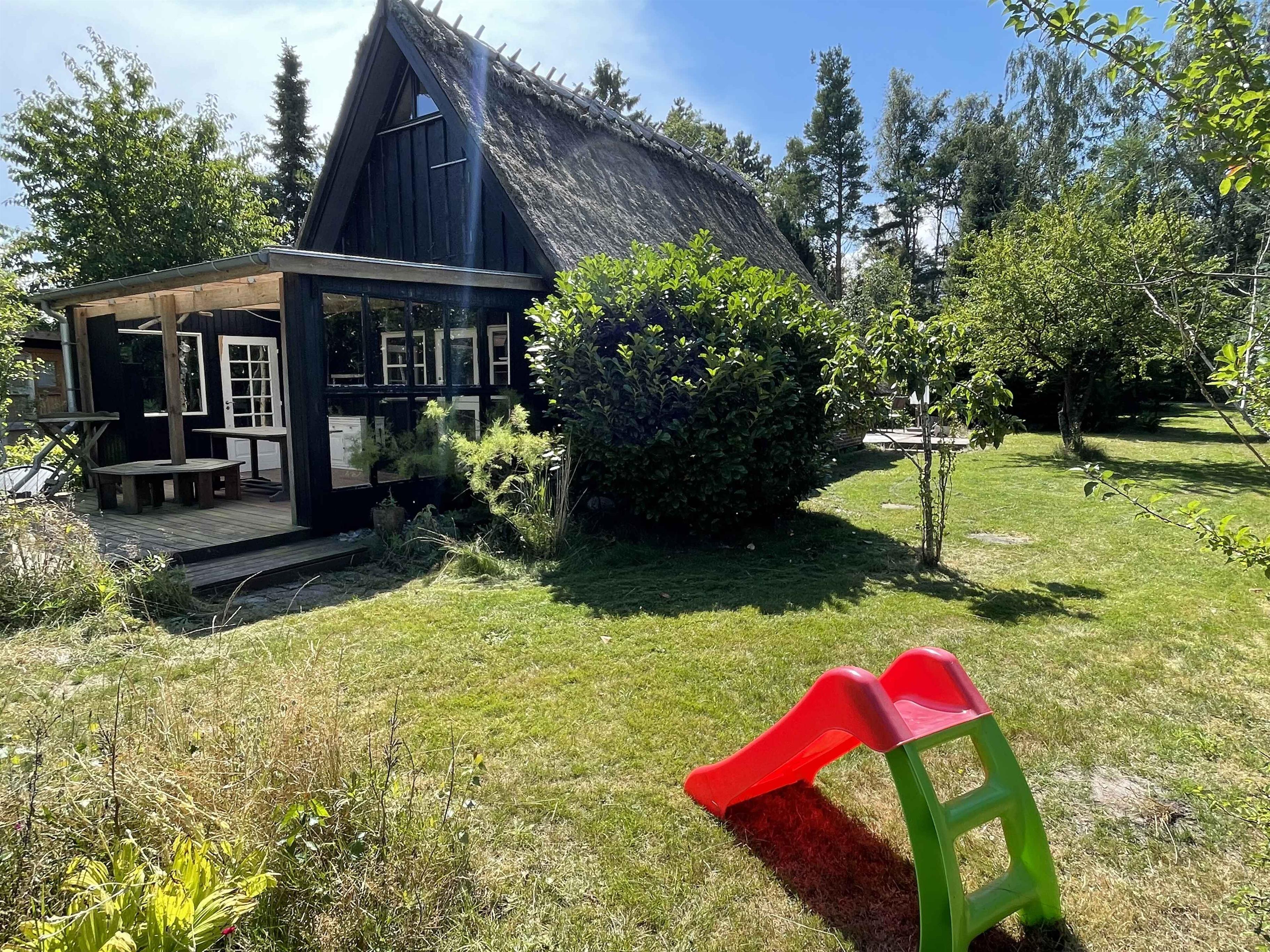 Charmerende sommerhus med stråtag og udsigt til Avnø fjord, tæt på vandet og naturen.