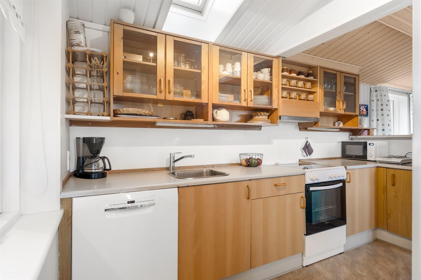 Køkkenet er udstyret med 1 køleskab. Der er 4 elkogeplader, varmluftovn, mikrobølgeovn samt opvaskemaskine.