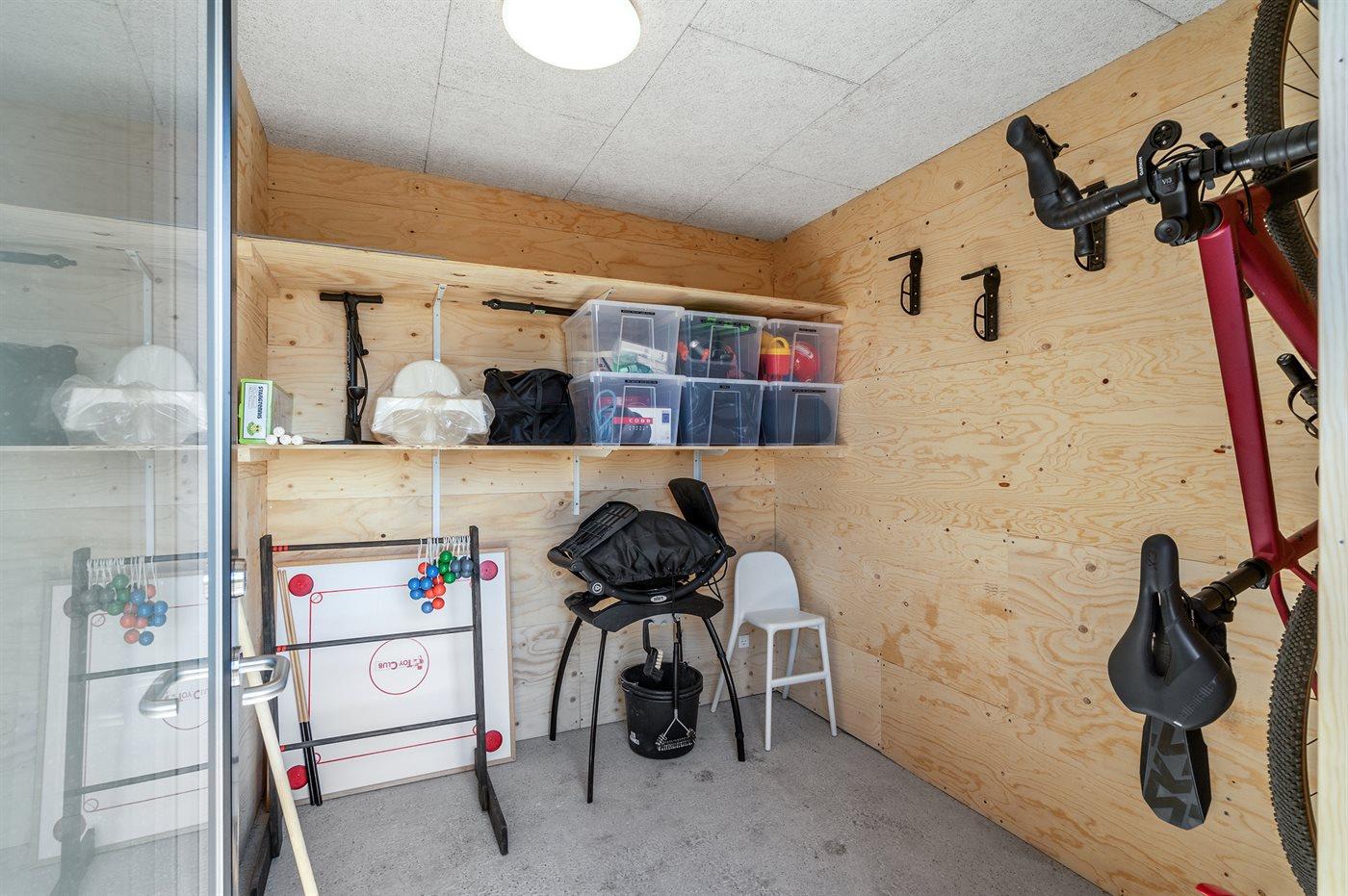 I det aflåselige redskabsrum kan du sikkert opbevare cykler, surfboards og andet fritidsudstyr. Her findes også vandslange, spand og blød børste til nem rengøring samt grill, stangtennis, bobspil og stigegolf.