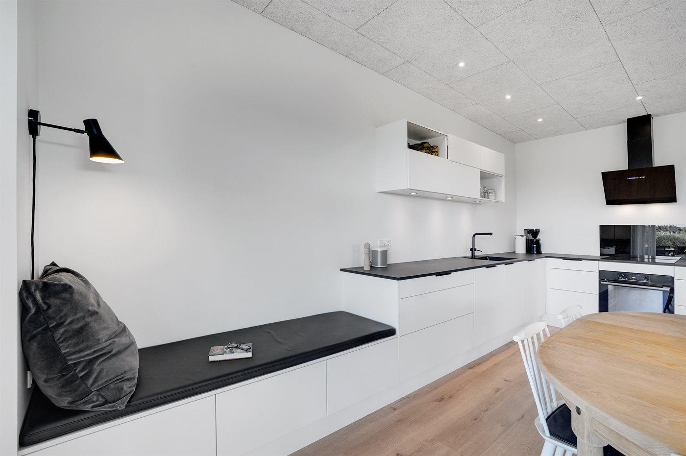 Rummeligt og veludstyret køkken med blandet andet induktionskogeplader med 4 zoner, varmluftovn, mikrobølgeovn, opvaskemaskine og køle-/fryseskab med 60 liter frysekapacitet.