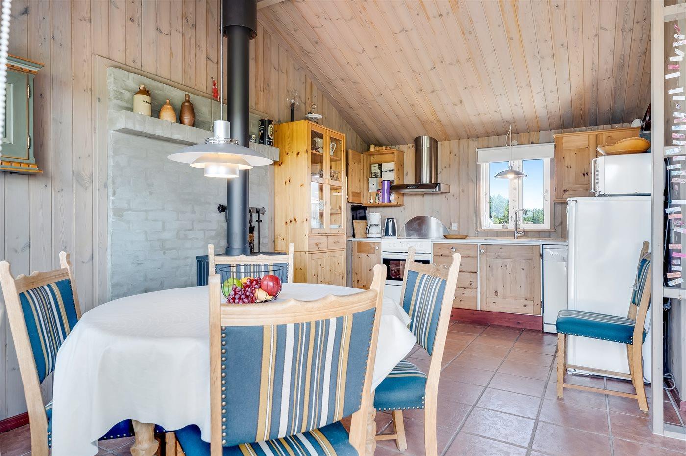 Køkkenet er udstyret med 1 køleskab. Der er 4 elkogeplader, varmluftovn, mikrobølgeovn samt opvaskemaskine.