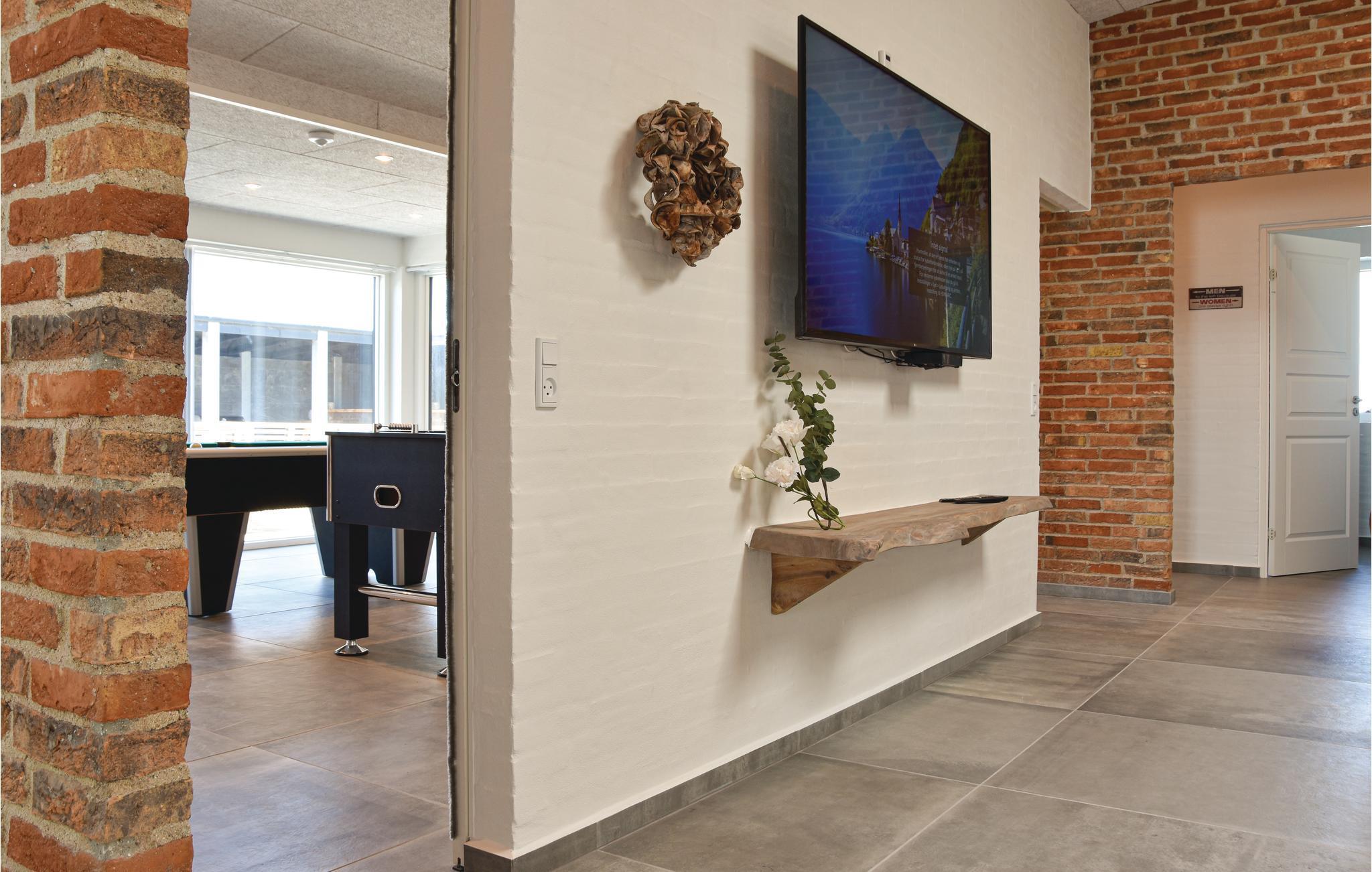 I aktivitetsrummet findes både billiard, bordfodbold, dart samt et tv med flere forskellige spillekonsoler. I gangen er der god plads til jer alles overtøj og fodtøj. Det åbne køkken er helt fantastisk indrettet med alt hvad en god køkkenentusiast kan ønske sig. Her er to ovne, to opvaskemaskiner, to komfurer og en ø med håndvask så det også er muligt at følge med i samtalerne der foregår i spisestuen - også her er der et ovenlysvindue, der giver det perfekte lys i rummet. I spisestuen er der god plads samt meget komfortable spisebordsstole og et stort fladskærms-tv så I kan følge med i nyhederne. Flere steder i huset er der rå mursten, som giver et råt, eksklusivt look. Terrasserne (både overdækkede og åbne) omkranser huset, og der er lavet en bar med borde I kan stå ved, så I kan holde et udeparty.