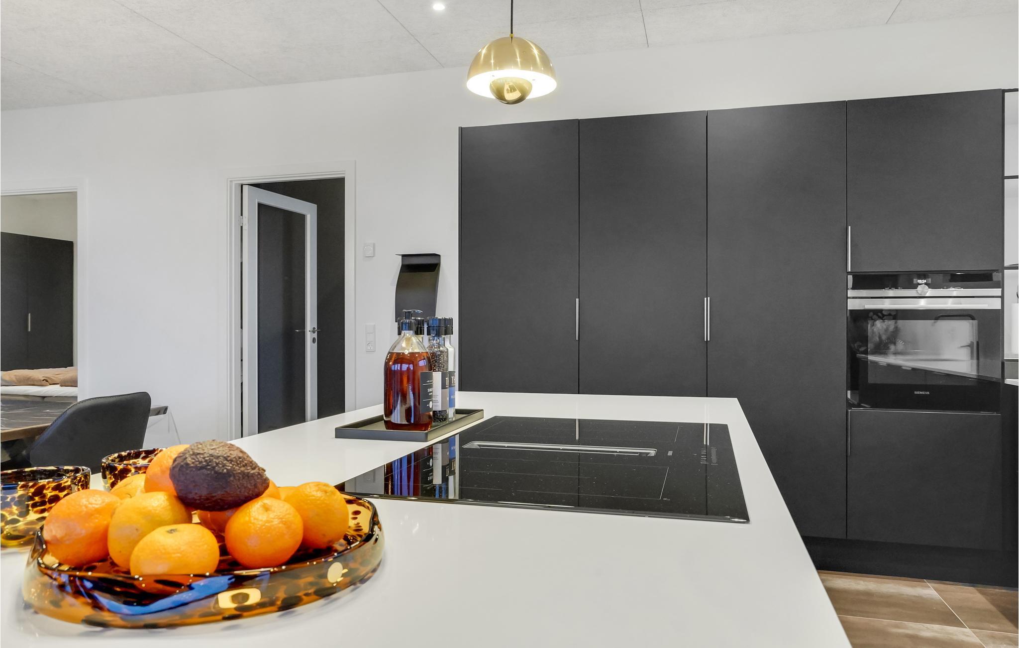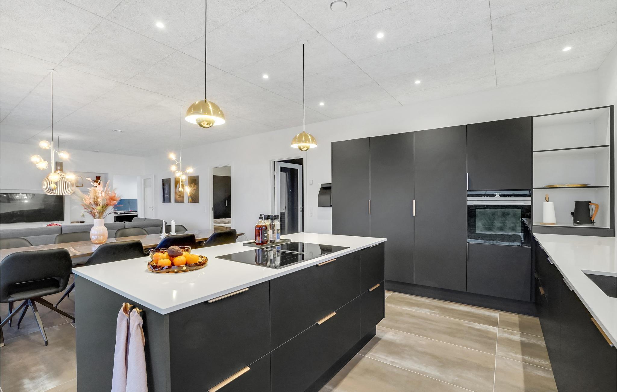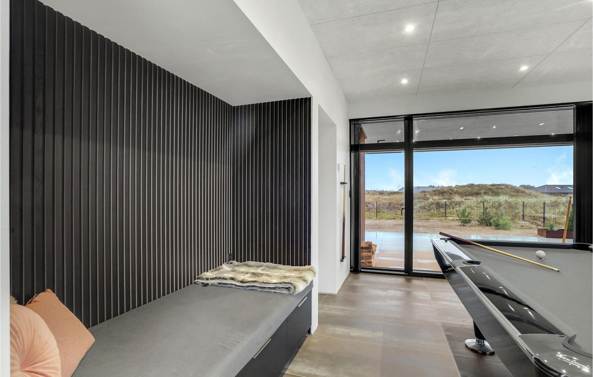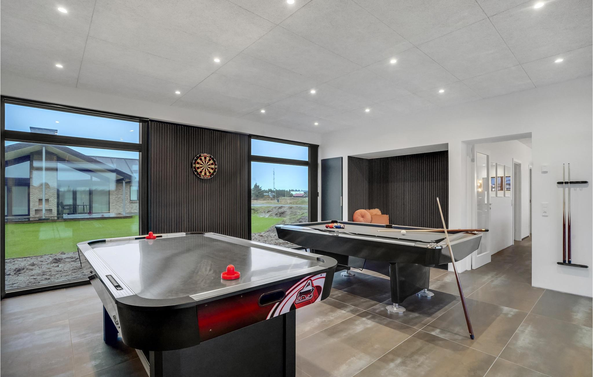 Møbler af høj kvalitet og smagfuldt design byder jer velkommen til denne smukke bolig. Det rummelige feriehus tilbyder masser af plads til at jeres store familie eller to familier, der er rejser sammen, kan slappe af og have det sjovt sammen. Et aktivitetsrum inviterer store og små til at spille spil og lege. Arranger turneringer i airhockey, billard, dart eller bordtennis og find jeres vinder. I kan slappe af i den store stue, som kombinerer madlavning, spisning og afslapning. Føl jer godt tilpas på det store sofaområde og lad jer underholde af en sjov serie eller film. På kølige dage eller aftener kan I tænde op i pejsen og nyde tiden sammen i en hyggelig atmosfære. Den store og delvist overdækkede terrasse indbyder til mange hyggelige timer udendørs. Om dagen kan I solbade og på milde sommeraftener kan I samles om hyggelige grillfester her.