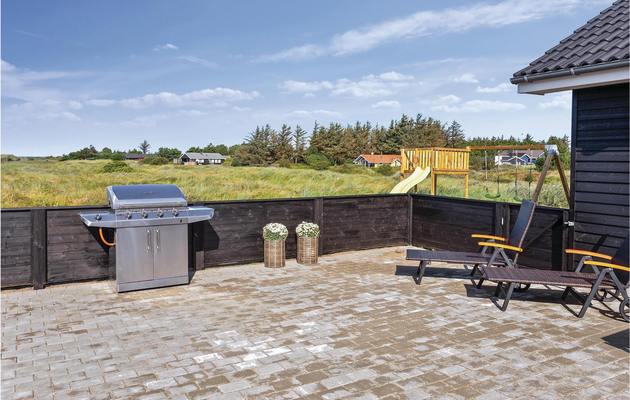 Udenfor kan I slappe af og nyde ferien i de mange liggestole på den store, lækre træterrasse, hvor I også finder havemøbler og en stor gasgrill. Her kan I lave mad til mange mennesker og nyde fantastiske grillaftener med udsigt ud over den jyske hede.