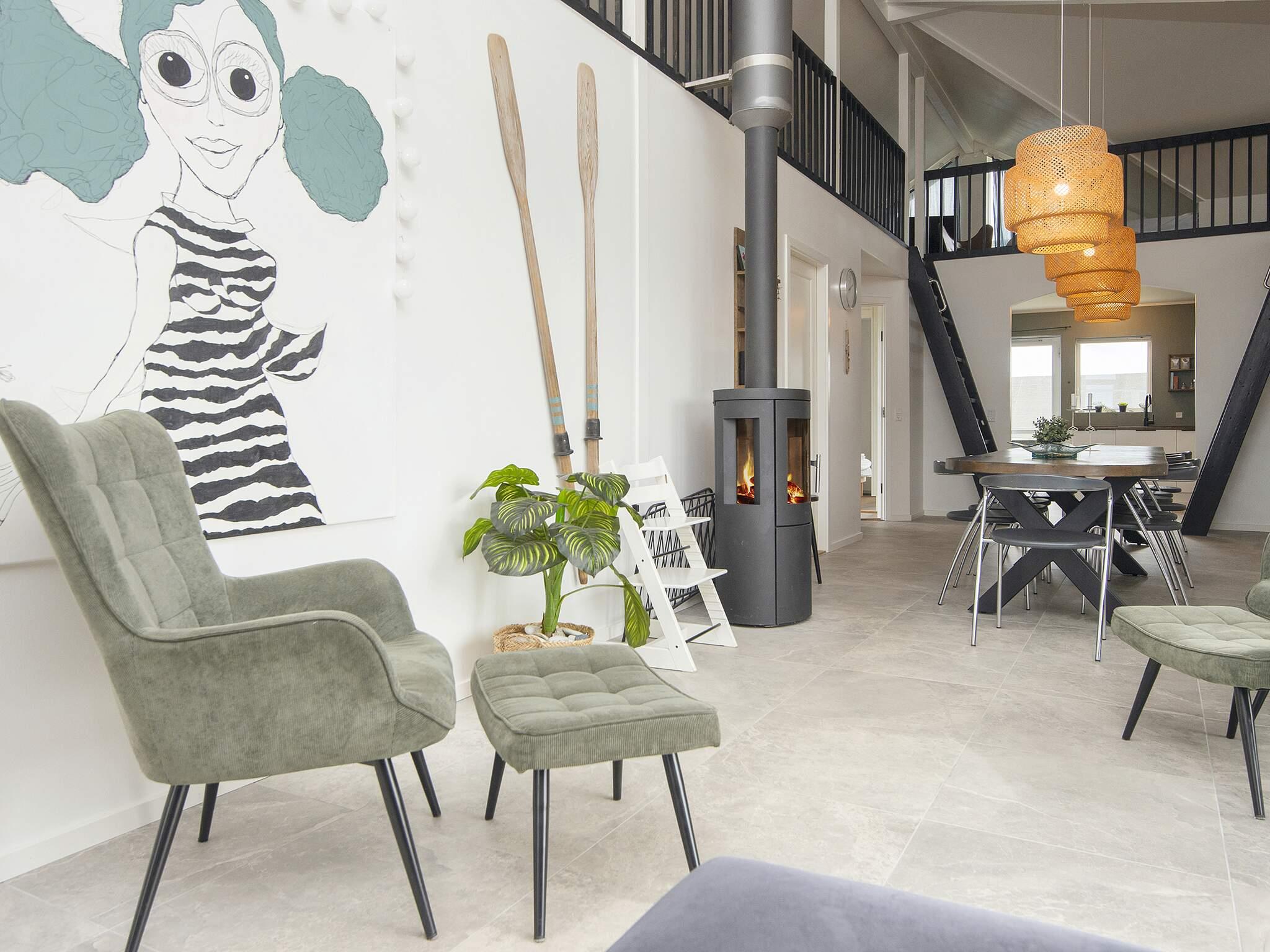 Fra entréen er der adgang til den store opholds- og spisestue med brændeovn, som skaber hygge på kølige sommeraftener eller regnfulde efterårsdage. Her er også smart-tv med både danske og tyske kanaler samt mulighed for at streame egne tv-tjenester.