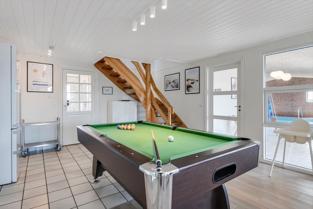Sommerhuset er gennemtænkt og skabt til den store familie eller til flere, der holder ferie sammen – og det mærkes straks, man træder ind. Lyse opholdsrum og komfortable møbler gør det nemt at føle sig hjemme, og det åbne køkkenalrum er et naturligt samlingspunkt, når måltider skal tilberedes og nydes i fællesskab. Er der børn og barnlige sjæle med i selskabet, vil poolrummet hurtigt blive et hit – her kan man boltre sig i timevis, og bagefter byder spaen og saunaen på velvære i roligt tempo. Det store opholdsrum har rigeligt med plads til at slappe af foran tv’et, og aktivitetsrummet med både poolbord og bordfodbold er perfekt til hyggelige dyster og grin i fællesskab. Alt i alt et sommerhus, hvor funktionalitet og feriestemning går hånd i hånd.