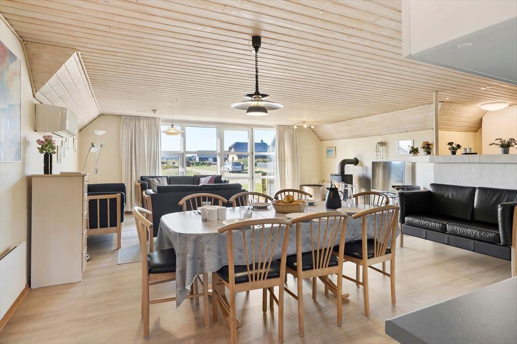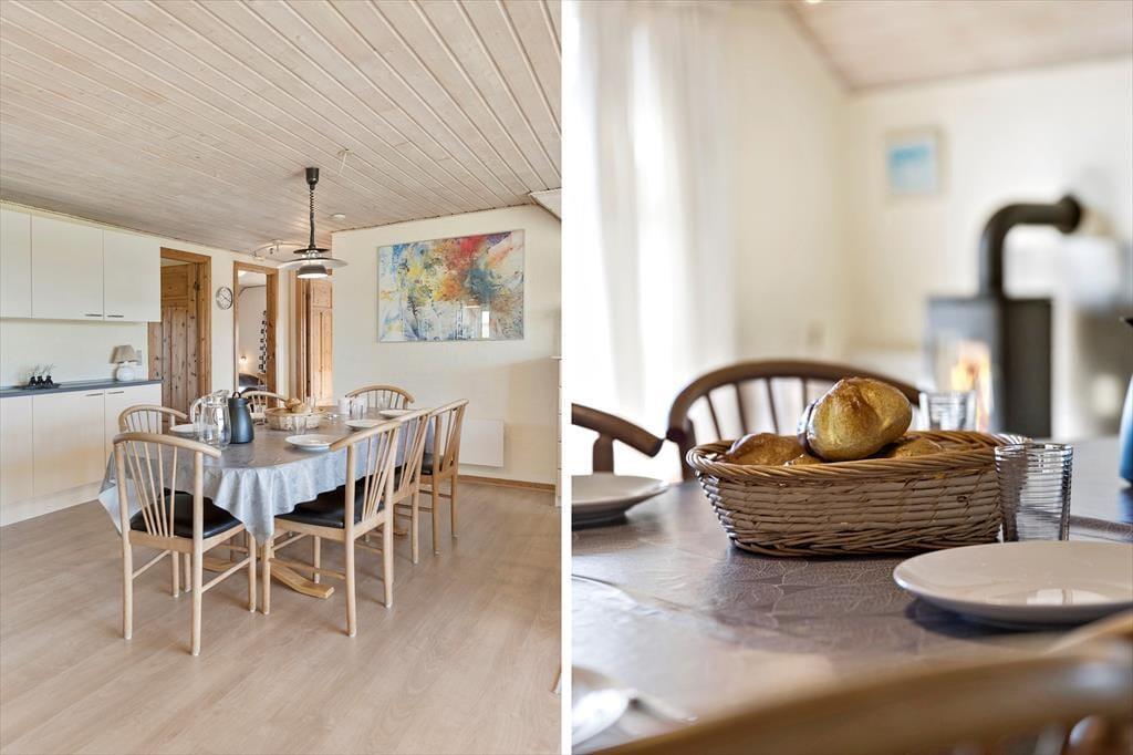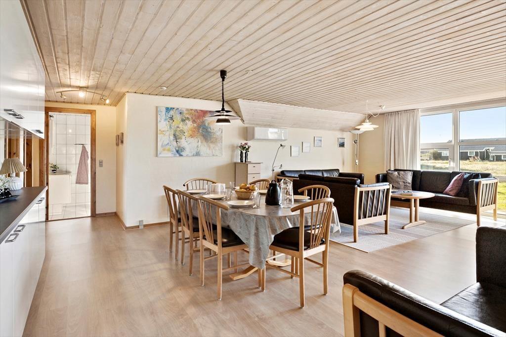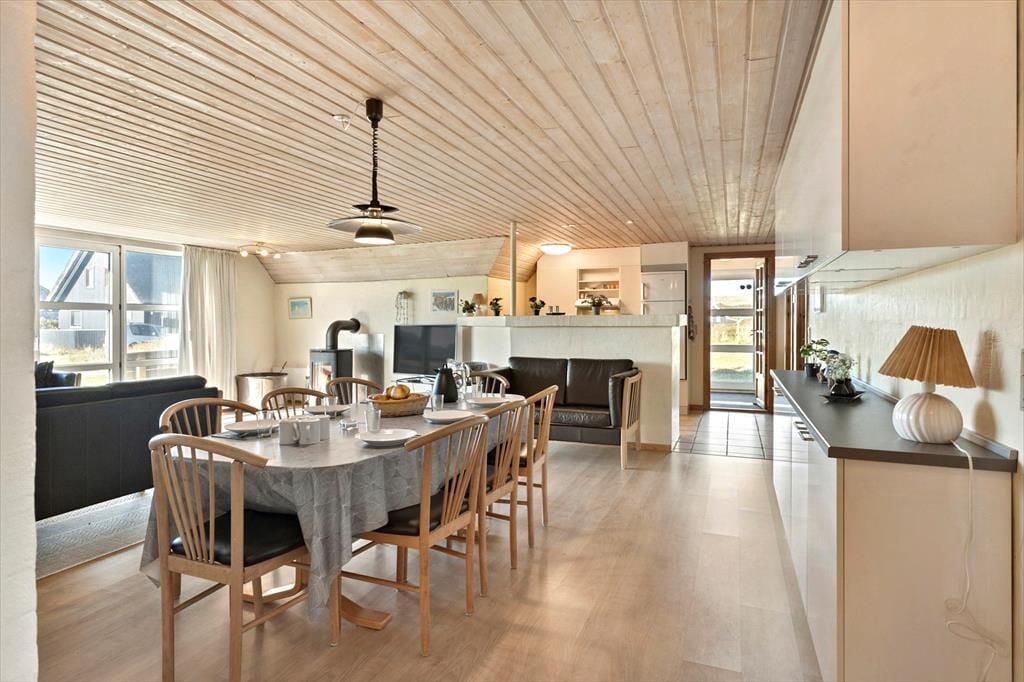 Når du træder indenfor i dette dejlige sommerhus på Fourmivej 56 i Vrist, mærker du straks den hyggelige stemning. Stue og køkken er smukt forenet i ét åbent opholdsrum, hvor store vinduer lader lyset strømme ind. Her kan du samles med familie og venner omkring spisebordet, mens duften af friskbagt brød breder sig fra køkkenet. I stuen lokker den varme brændeovn med sine dansende flammer – perfekt til en afslappende stund efter en lang dag ved Vesterhavet. Huset har plads til otte gæster fordelt på fire værelser, så der er god mulighed for at nyde ferien sammen med dem, du holder af. Med to badeværelser og en indendørs spa er der sørget for ekstra komfort, så du kan forkæle dig selv med et varmt boblebad, uanset vejret udenfor.