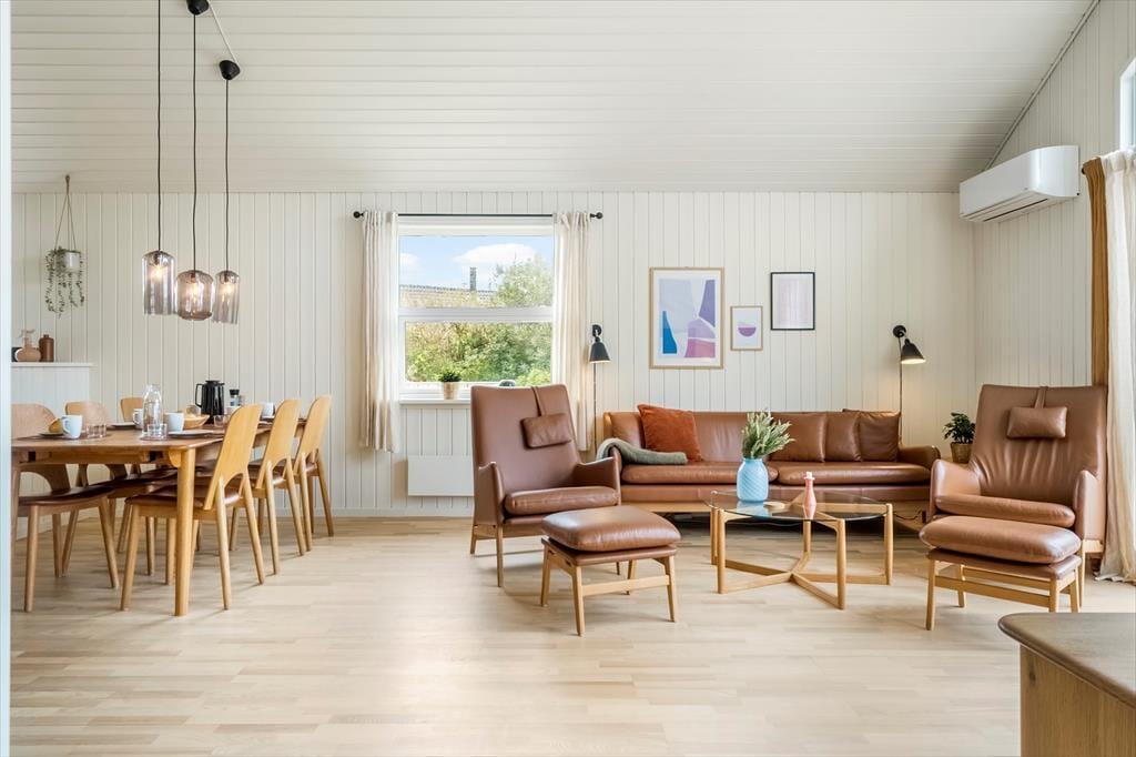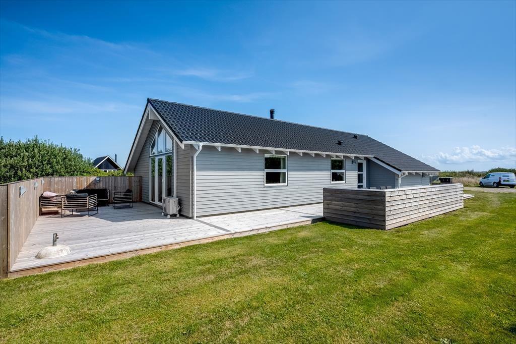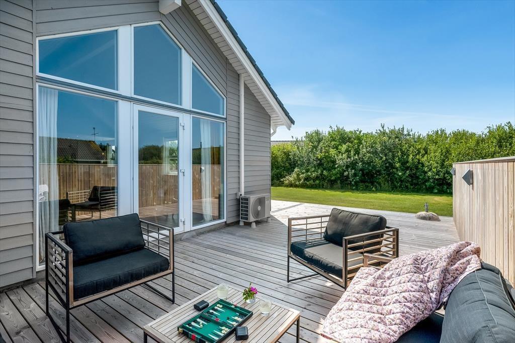 Når solen skinner, og dagene er lange, er det udenfor, ferielivet for alvor folder sig ud. Den store træterrasse på 80 m² giver masser af plads til at læne sig tilbage i en liggestol, spise dagens måltider i det fri eller måske bare læse en god bog i skyggen. Mod øst er 20 m² af terrassen overdækket, så du altid kan finde et behageligt sted at sidde – også hvis duggen falder eller solen står lavt på himlen. Træerne omkring grunden skaber ikke kun læ, men også en særlig stemning af privatliv og fred, som er svær at finde andre steder. Her er der plads til både børn, voksne og hunde – og tid til bare at være til stede.