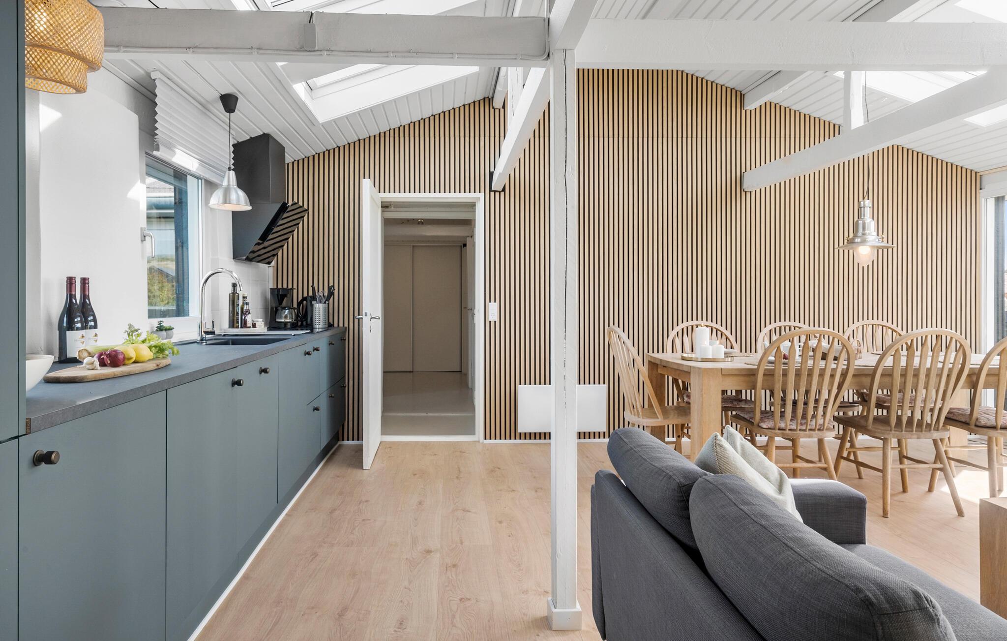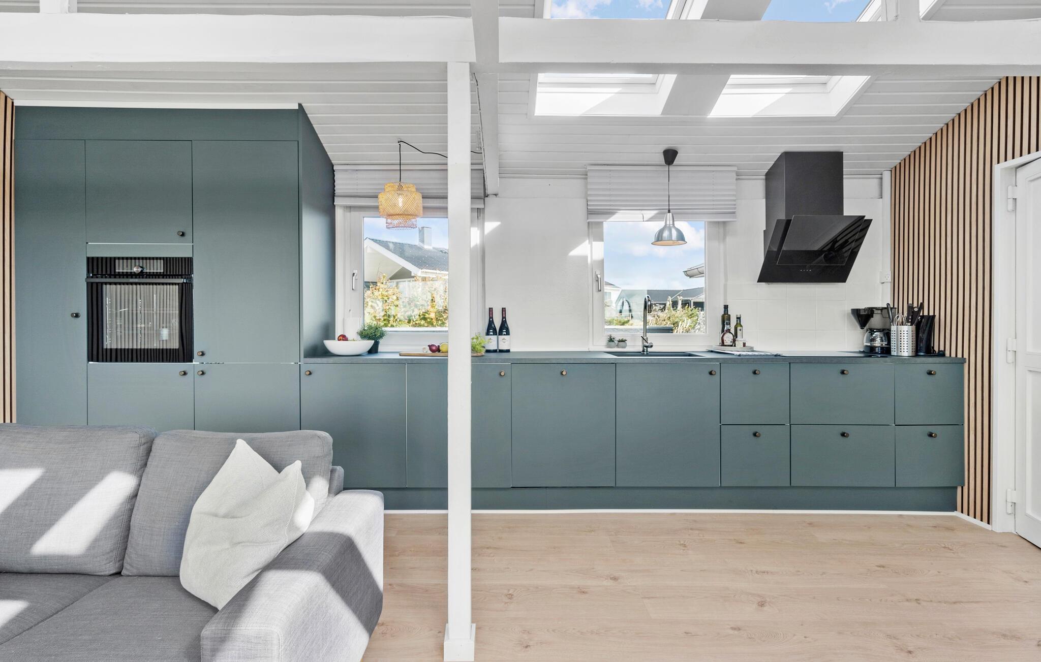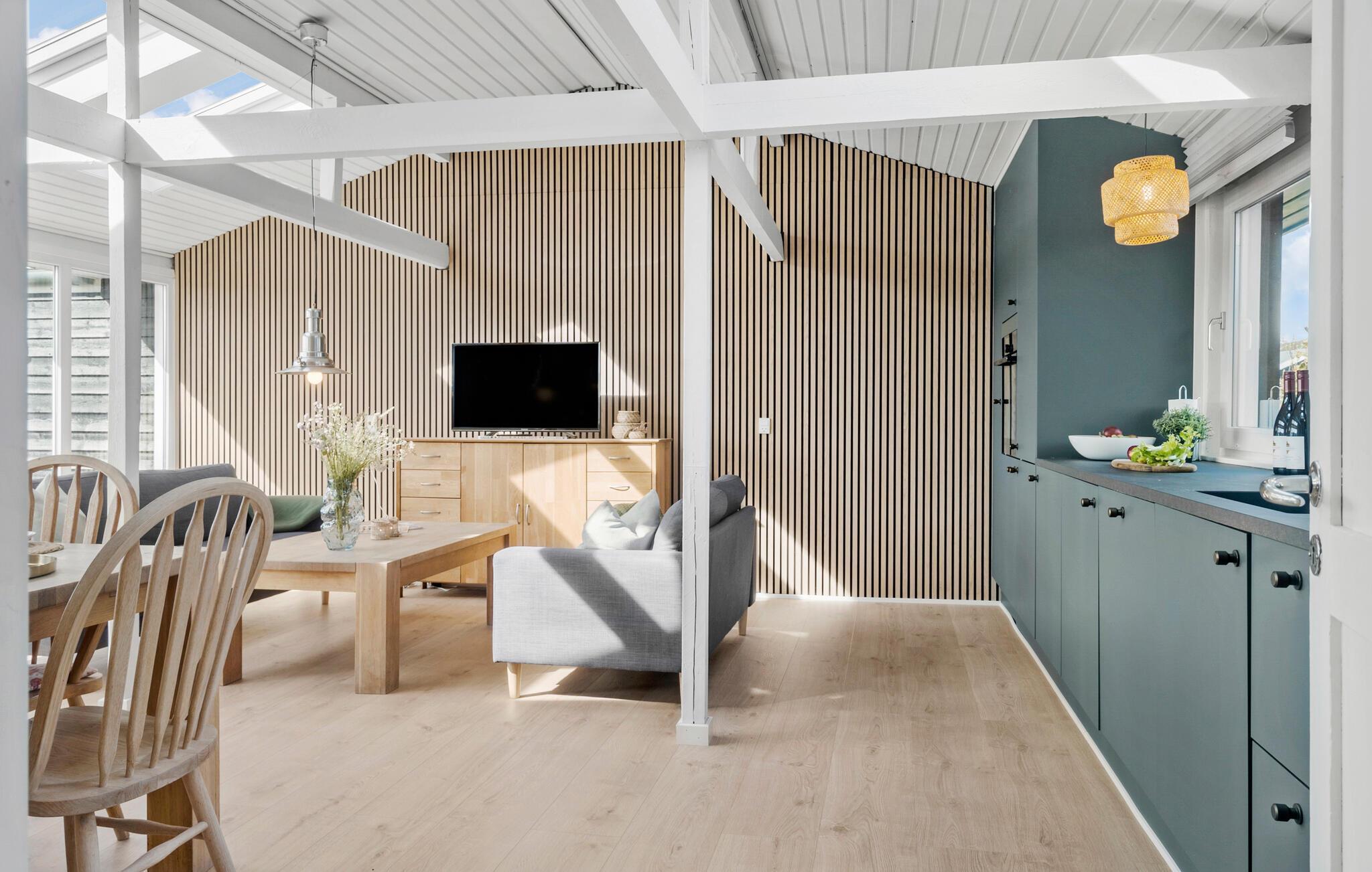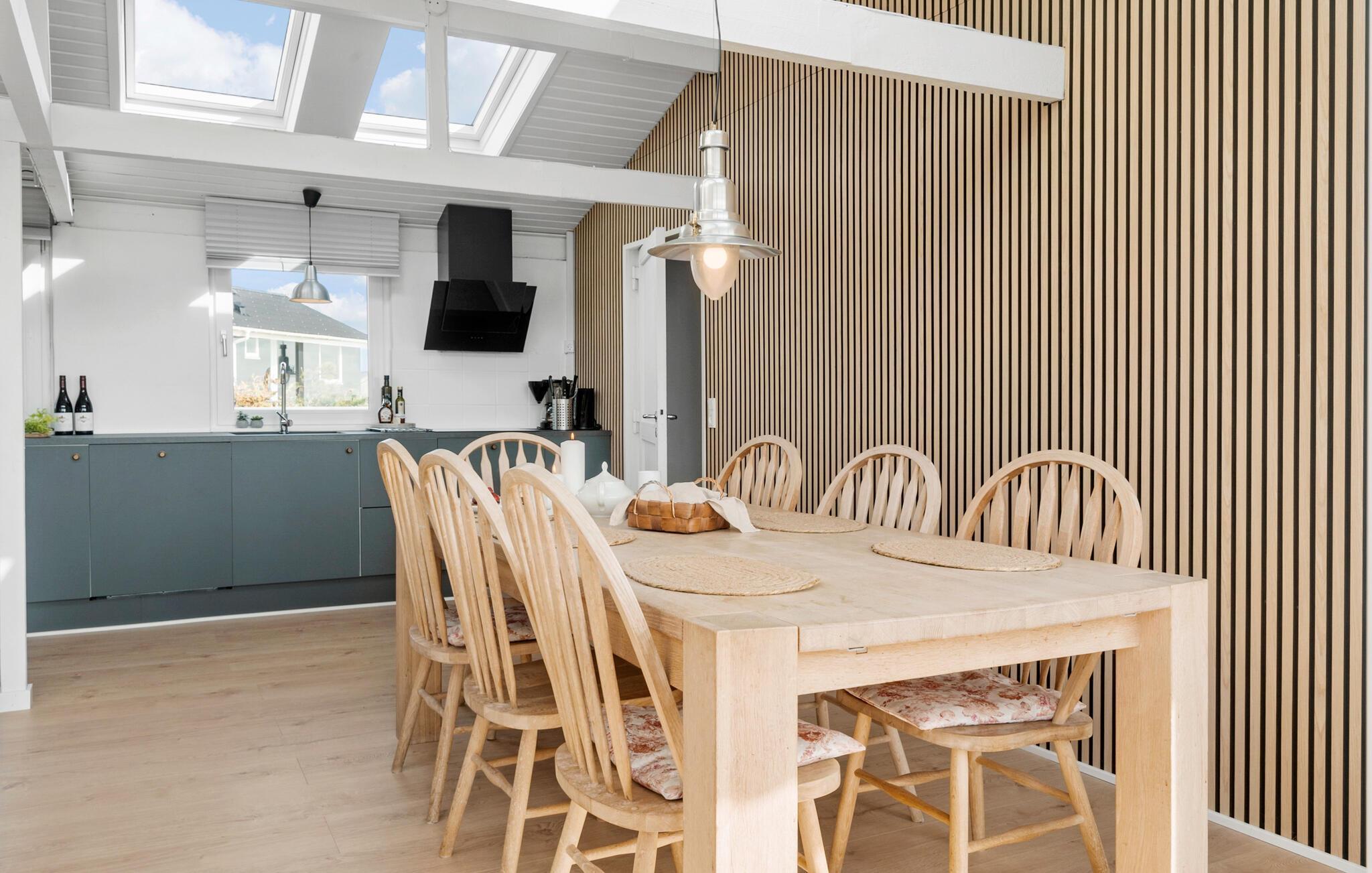 Hyggeligt feriehus tæt på Vrist Strand med stor terrasse og plads til kæledyr.