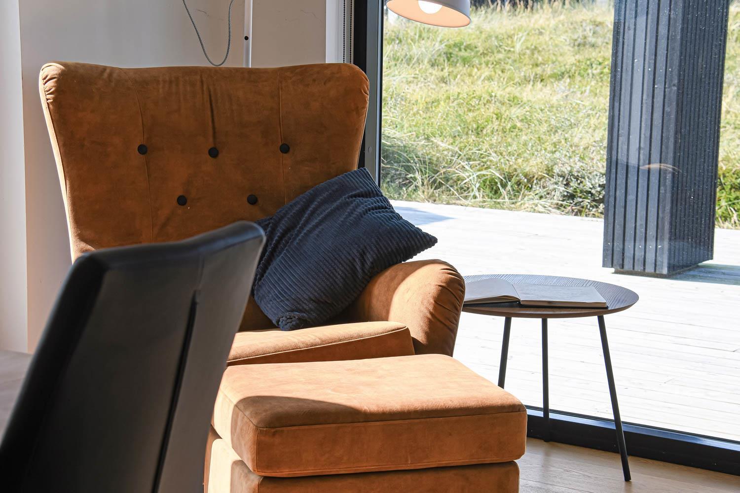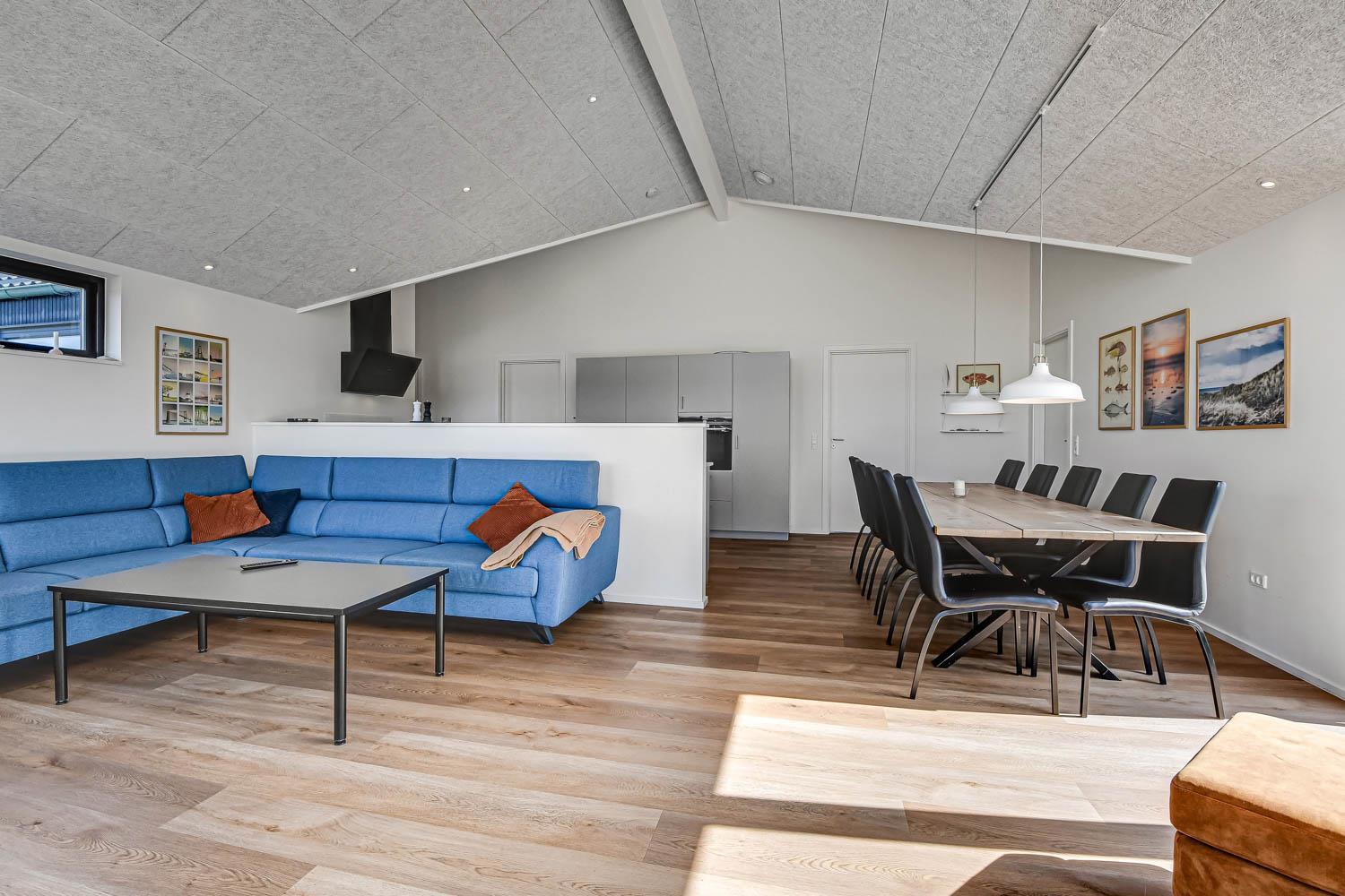 Dette flotte feriehus på 120m2 er indrettet med kombineret køkken og stue, hvor loftet er åbent til kip, og de store vinduespartier giver et godt lysindfald, der gør rummet lyst og venligt. Det flotte køkken er indrettet med alt i service og køkkengrej. Der er el-keramisk kogeplade, emhætte, indbygget ovn, mikroovn, dobbelt køle-/fryseskab og opvaskemaskine. Spisebordet er placeret i forbindelse med køkkenet. Stuen er indrettet, så man fx kan nyde udsigten til klitterne eller se TV. Der er smart-TV med fibernet, TV med tyske og danske programmer. Der er fra stuen to udgange til den store terrasse.