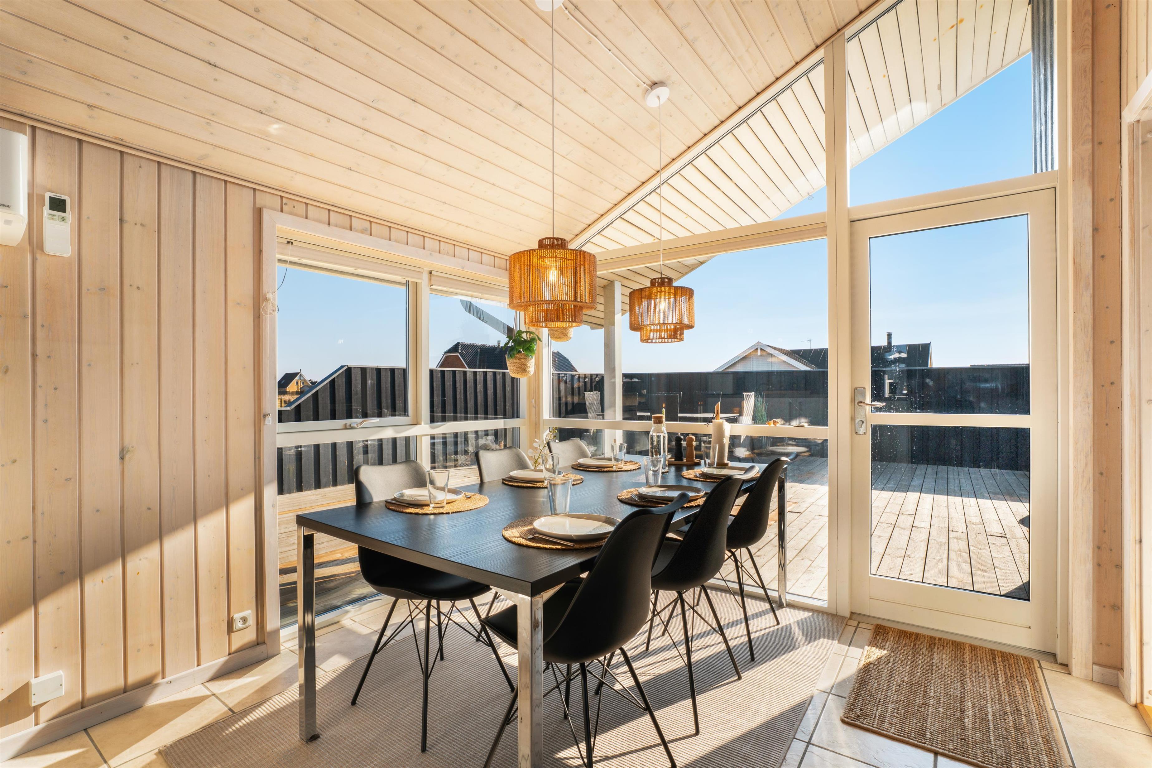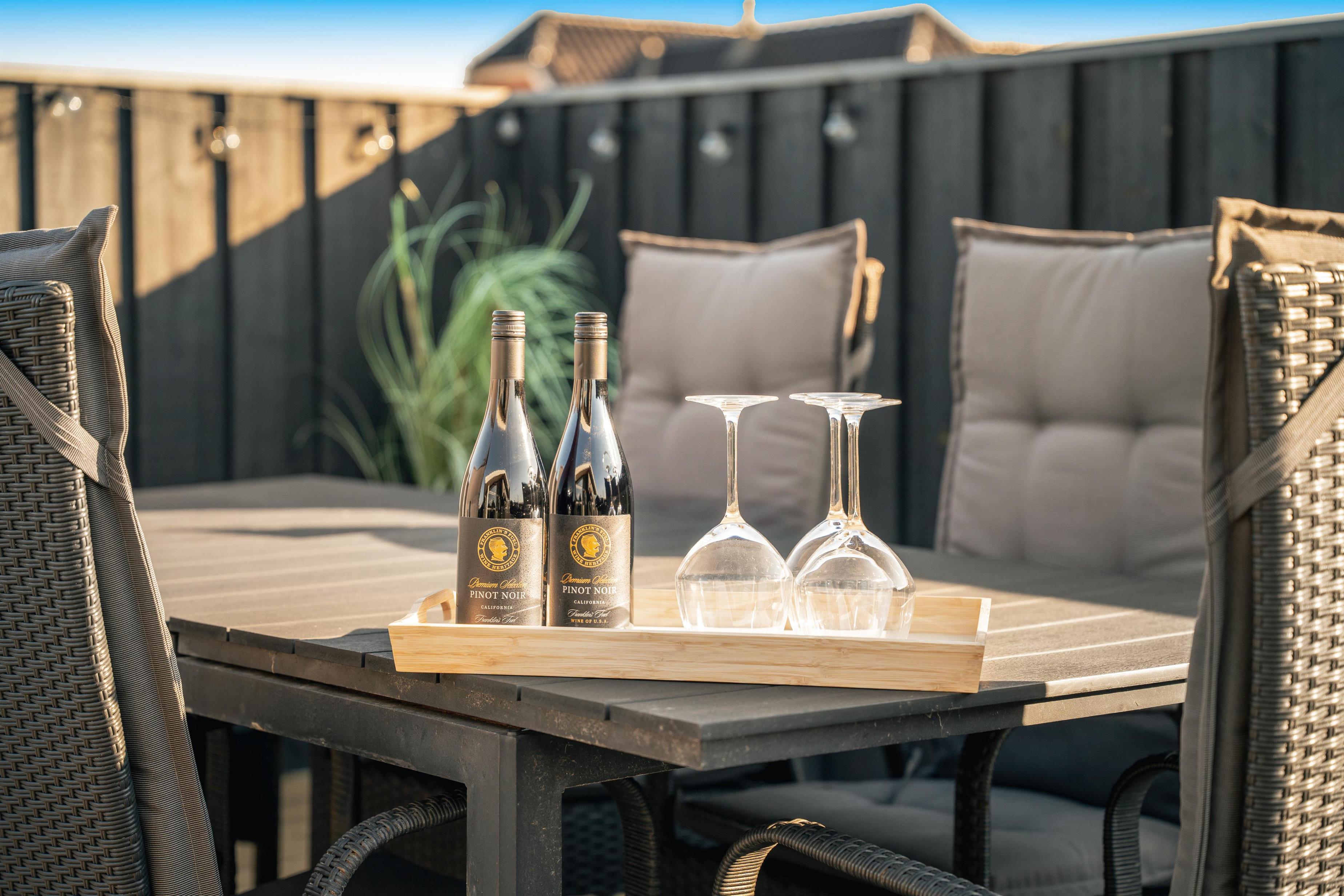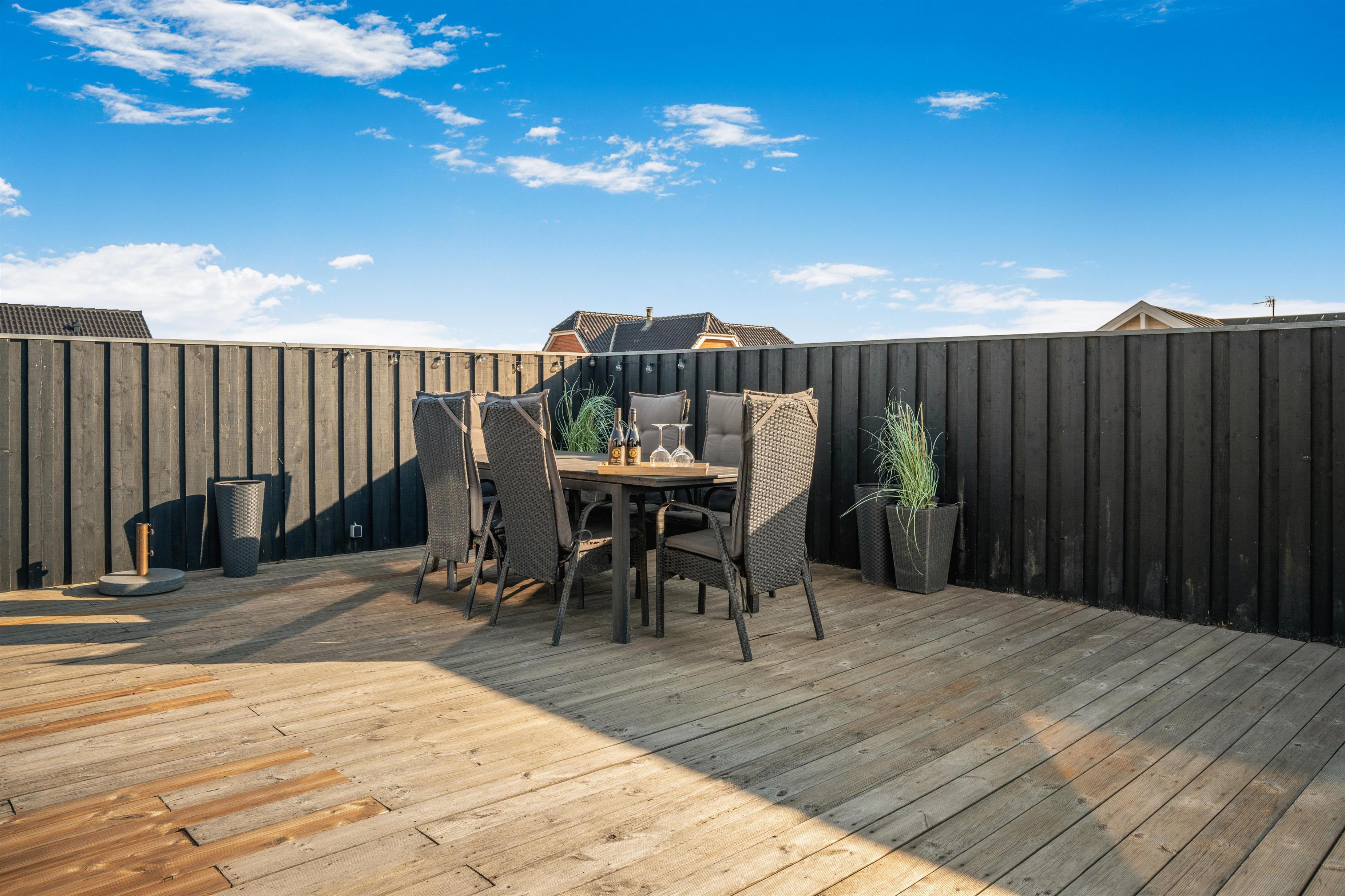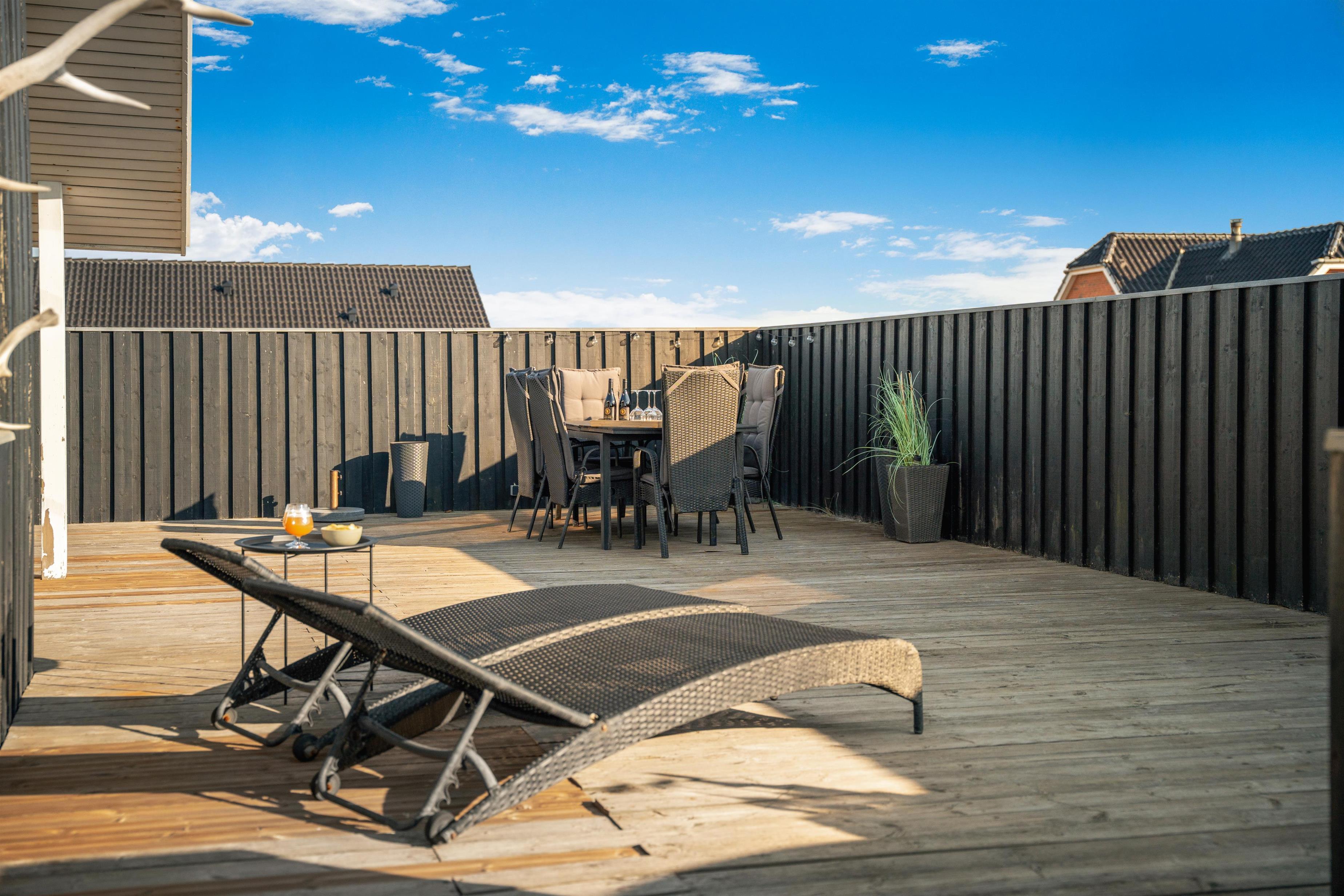 Den store, lukkede træterrasse er privat og giver mulighed for altid at finde læ – der er sol fra tidlig morgen til sen aften – perfekt til morgenkaffe, solbadning eller aftensmad under åben himmel.