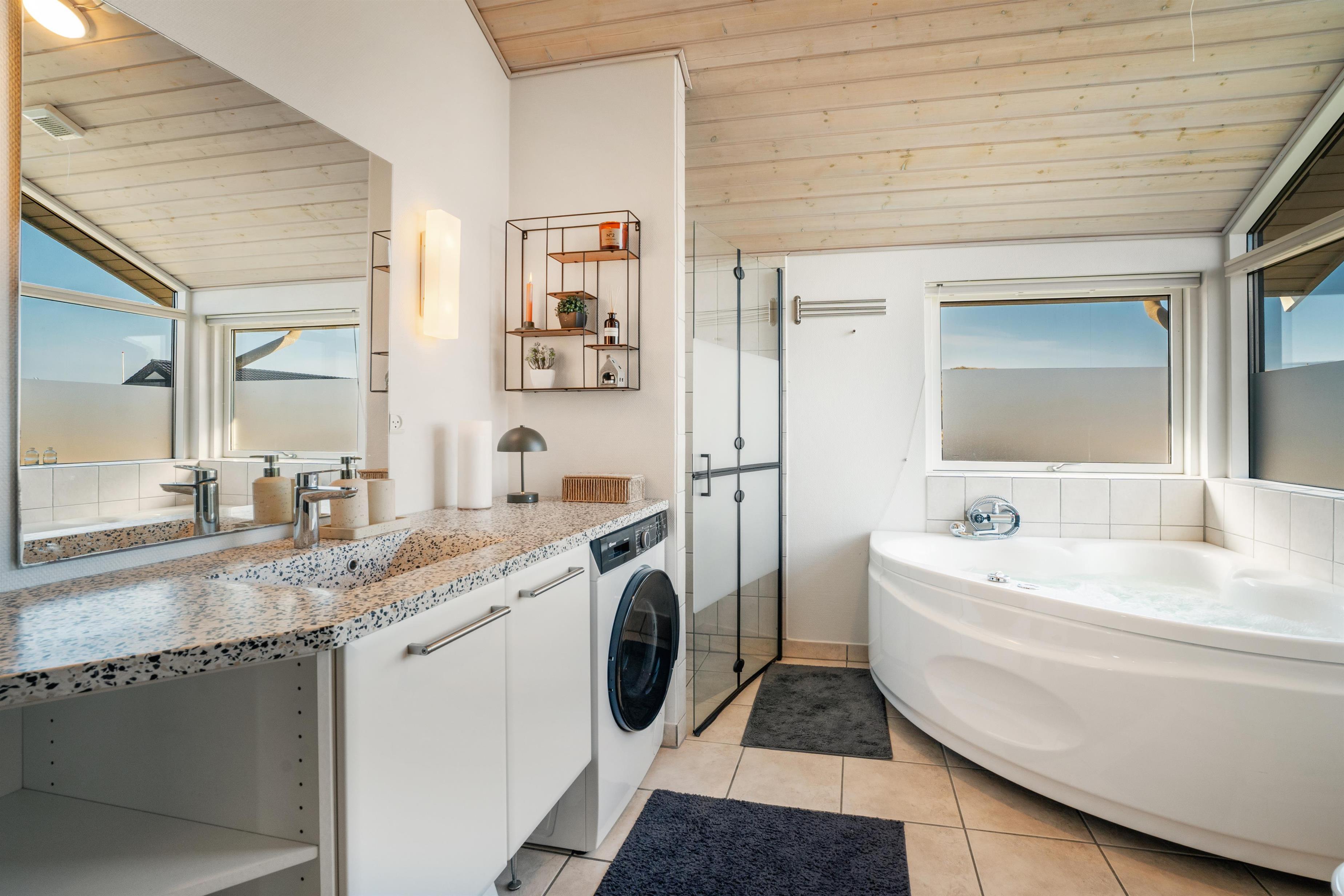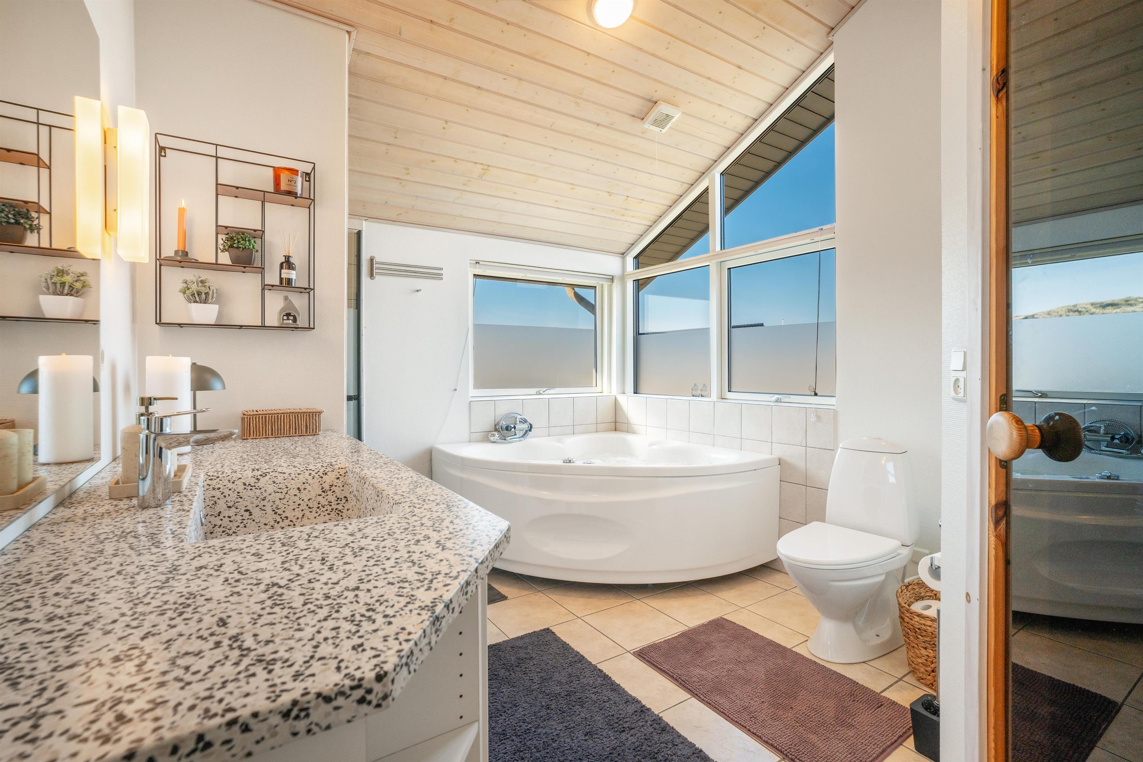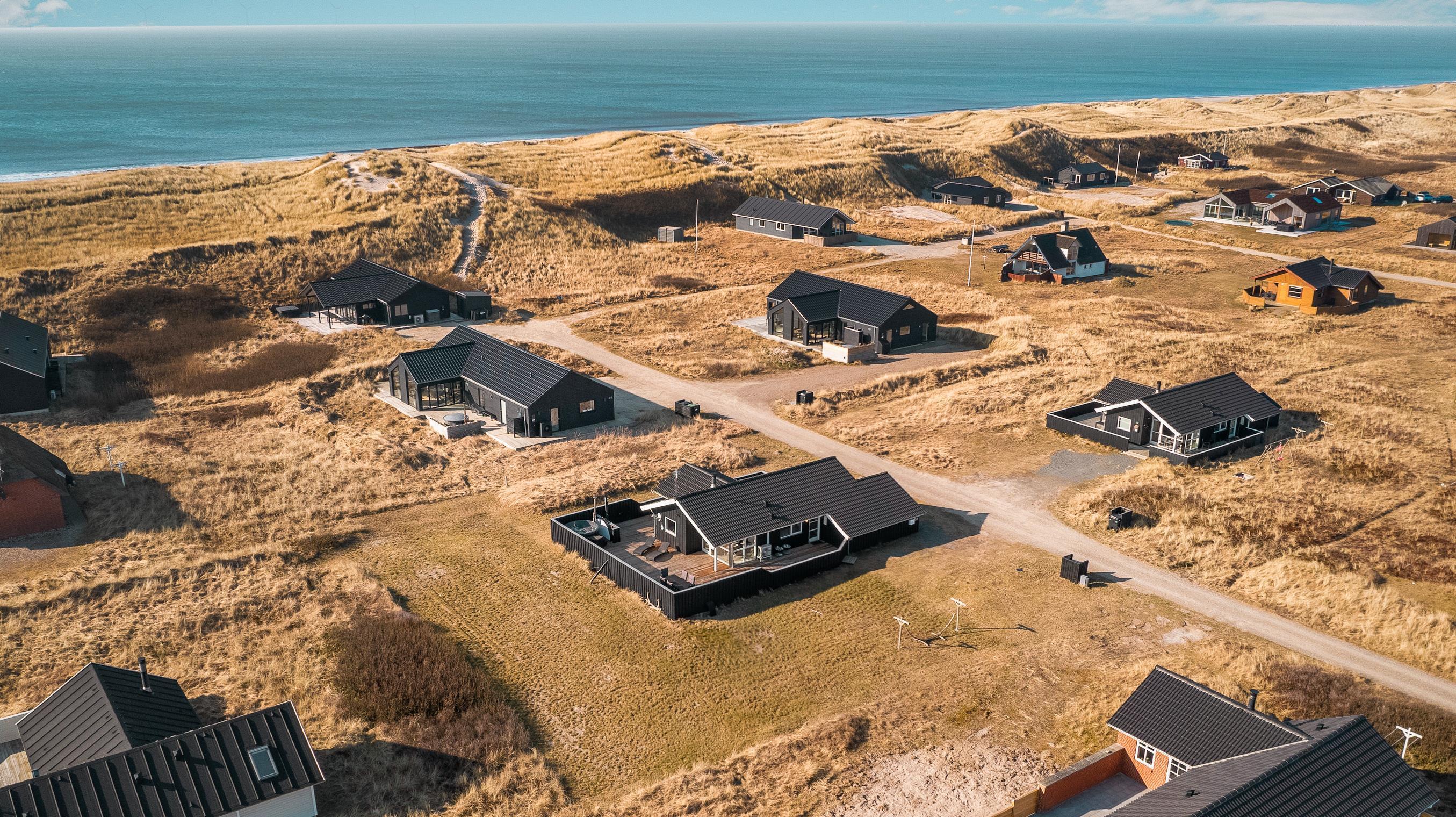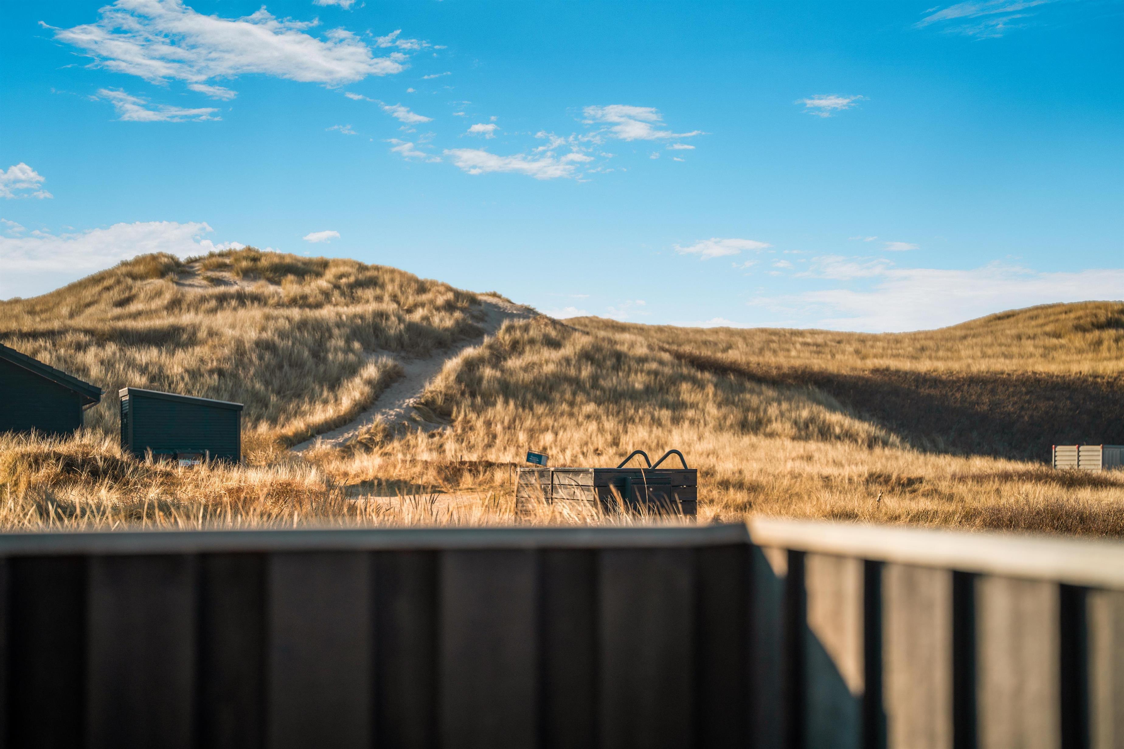 Efter en frisk gåtur i klitterne kan du vælge mellem den indendørs spa og sauna – eller hoppe i det udendørs vildmarksbad med bobler og udebruser, hvor udsigten over klitterne fuldender oplevelsen.