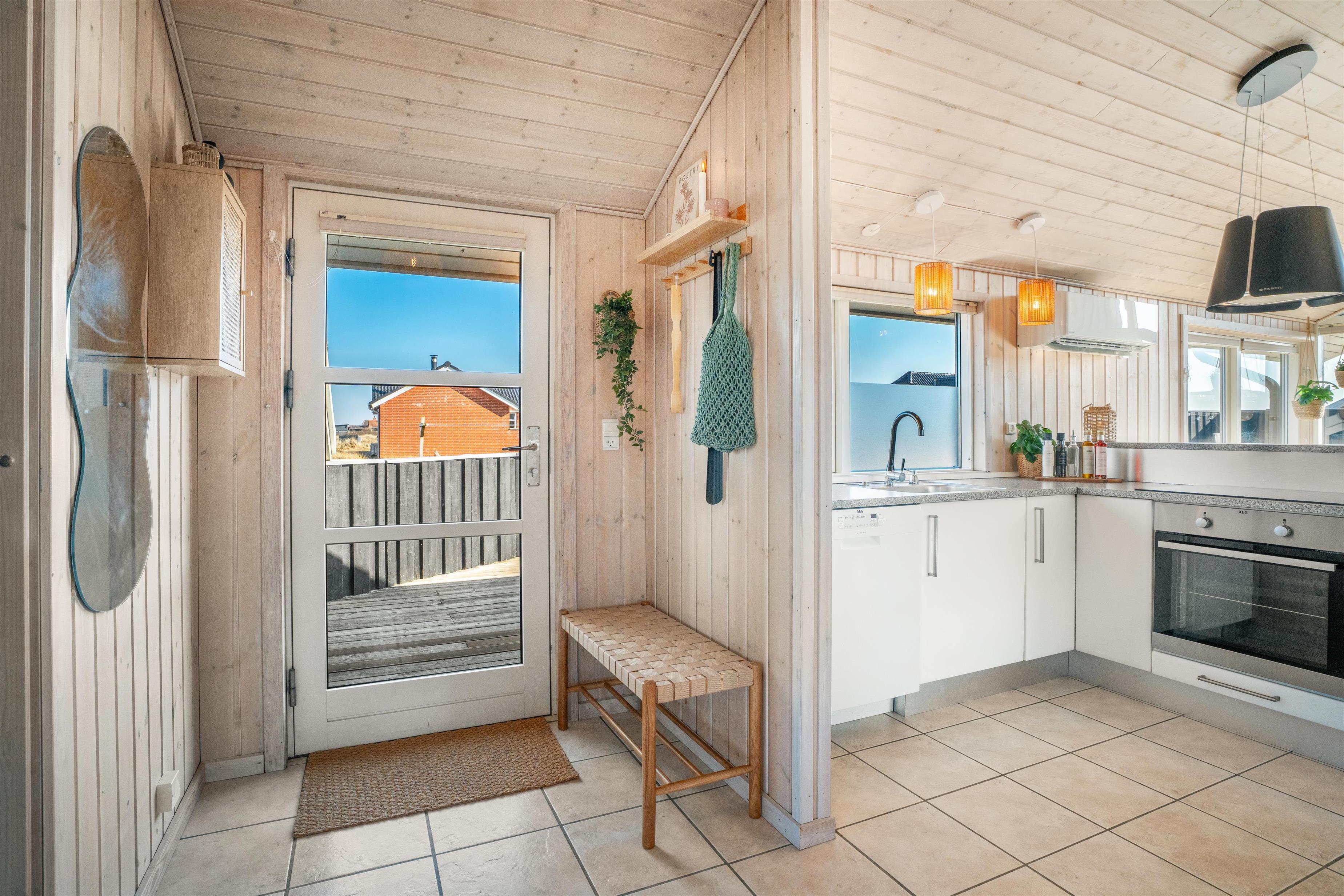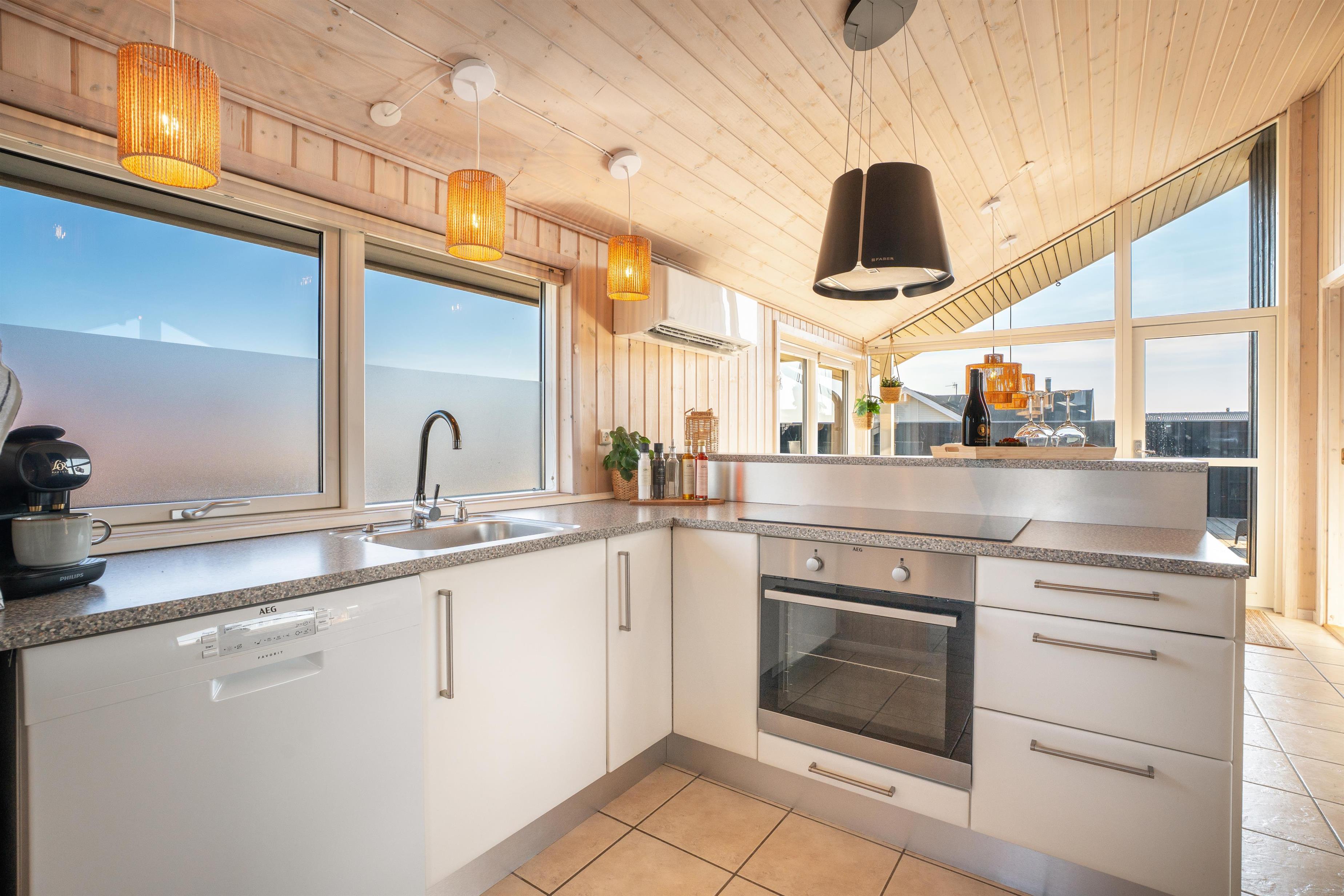 Køkkenet er moderne og funktionelt med ovn, keramisk komfur, mikroovn, kaffemaskine og køle-/fryseskab – alt, hvad I har brug for til feriens måltider.