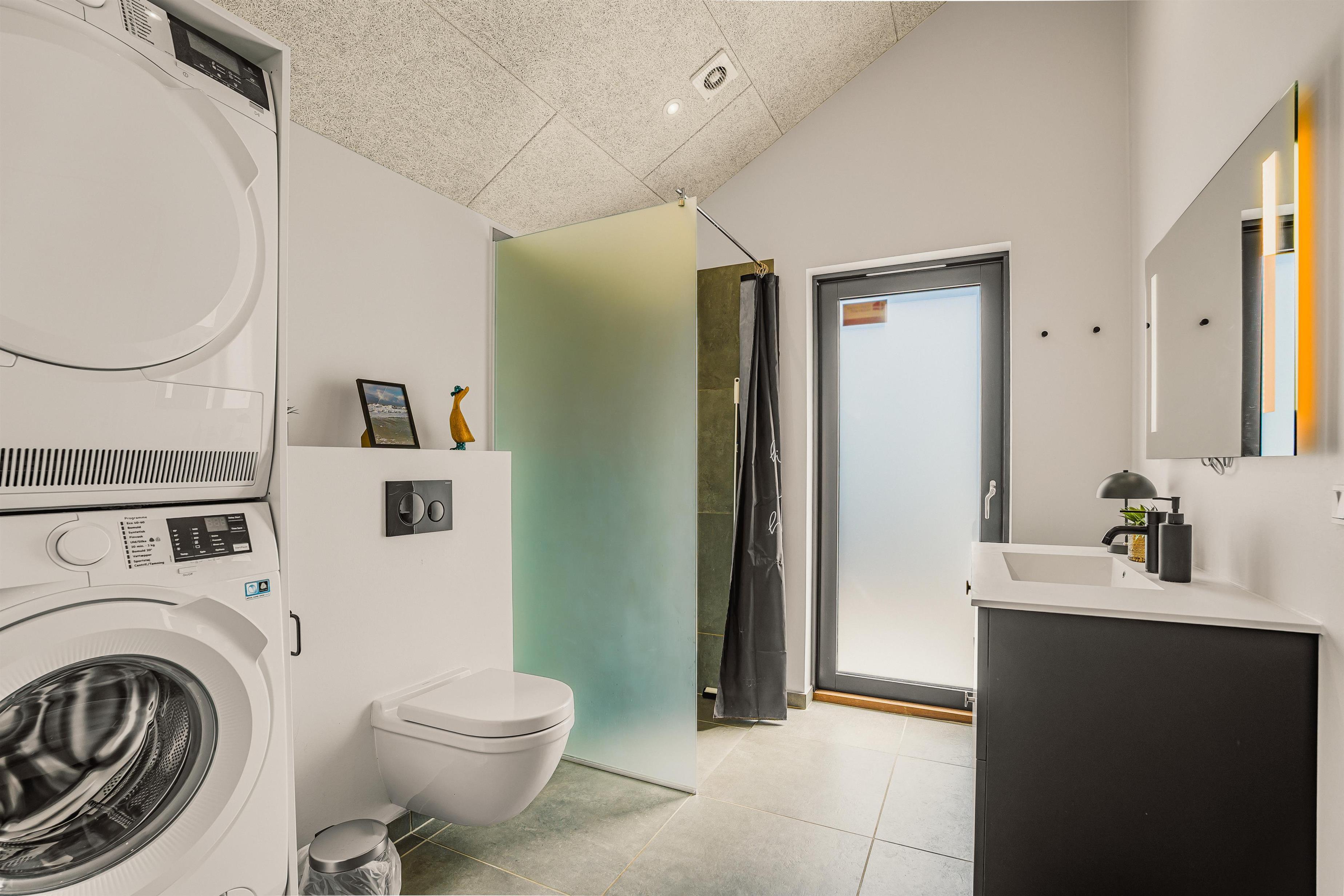 Huset rummer yderligere et stort badeværelse med bruser, toilet og håndvask, og her er der også adgang til husets indendørs sauna. Den direkte udgang til terrassen herfra gør det oplagt at kombinere wellness med den friske havluft – for eksempel en varm sauna efterfulgt af en pause i liggestolen under åben himmel.