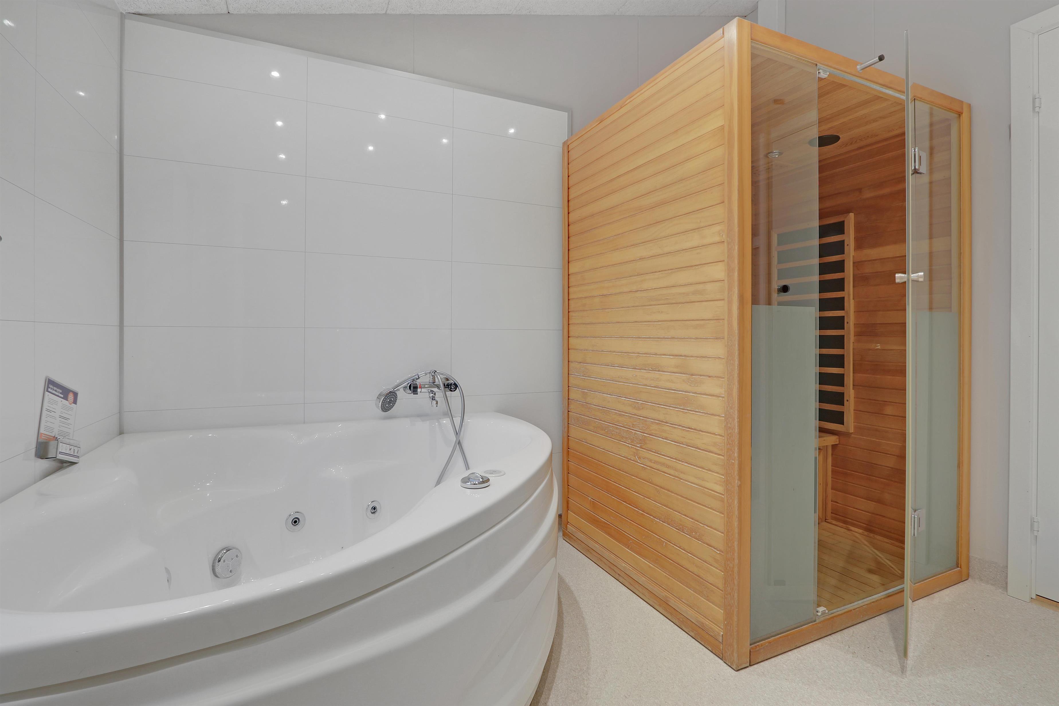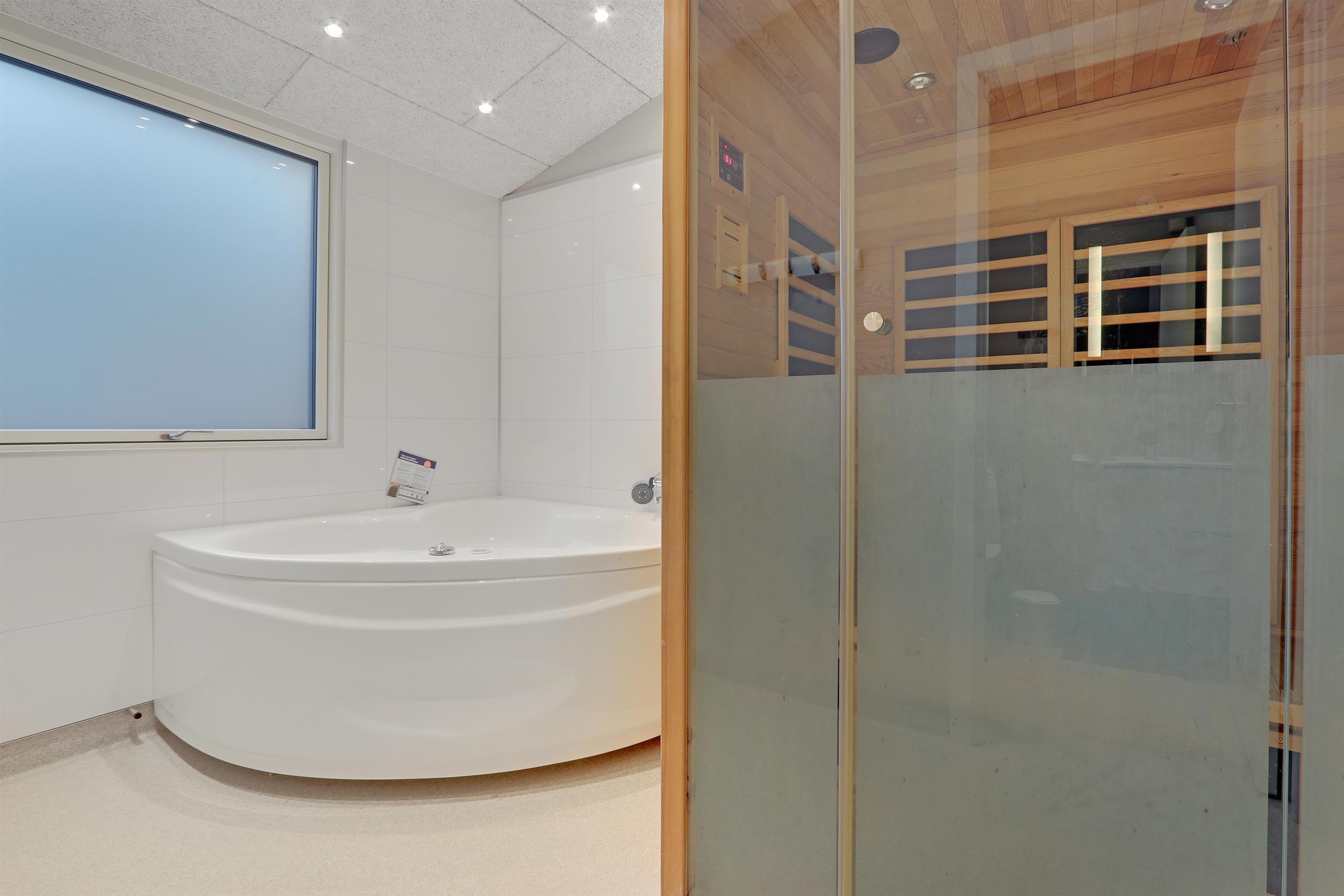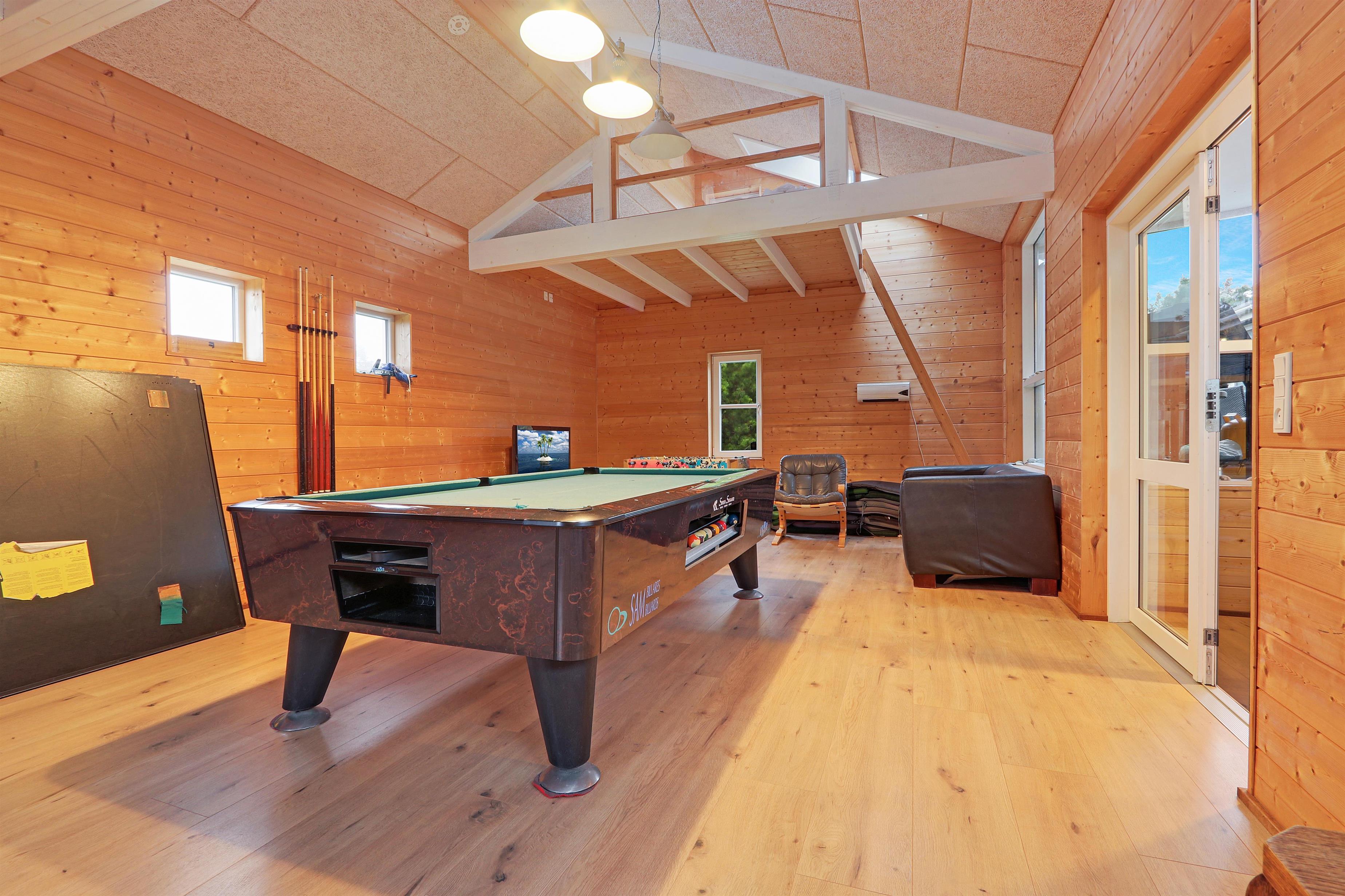 Velindrettet feriehus på 216 m2. 5 dejlige soverum med helt nye senge (1DS+1KS, 1DS+1KS, 1DS, 1DS, 2ES). Derudover forefindes 1 store hems med hver 2 sovepladser. Huset er med et veludstyret nyere køkken alrum med alt i hårde hvidevarer. Stor glaskeramisk plade, emhætte, indbygningsovn, opvaskemaskine, mikroovn, 2 køle / fryse skabe. Alle 12 beboere kan samles om husets store spisebord som også er perfekt til spil og hyggesnak. Slap af i de bløde lædermøbler. Se TV på dansk og tysk på husets Smart-TV med tyske og danske programmer samt mulighed for streaming af TV / radio / Apps, så har du en mobiltelefon eller et andet device med kan du streame hvad du nu har abonnement. Der er trægulve i opholdsrum og gulvtæpper i soveværelserne. Tænd op i brændeovnen som let hjælper med opvarmningen sammen med varmepumpen eller blot sørger for en hyggelig stemning. Fra fordelergangen er der udgang til en totalt privat terrasse med en stor udendørs spa. Aktivitetsrummet indeholder: dart bordfodbold og kombineret pool / billard. Vaskemaskine og tørretumbler er en selvfølge. 2 badeværelser. Det store badeværelse har toilet, bruser, håndvask, gulvvarme samt Wellness- / saunaafdeling med spabad med massagedyser samt dejlig infraød sauna et ekstra toilet med håndvask. Det andet badeværelse har ligeledes toilet, håndvask, gulvvarme og en dejlig bruser. Herudover er der endnu et toilet med håndvask. Til børnene er der barneseng og barnestol. Max. 2 husdyr er tilladt. Ikke ryger hus. Huset lejes ikke ud til ungdomsgrupper