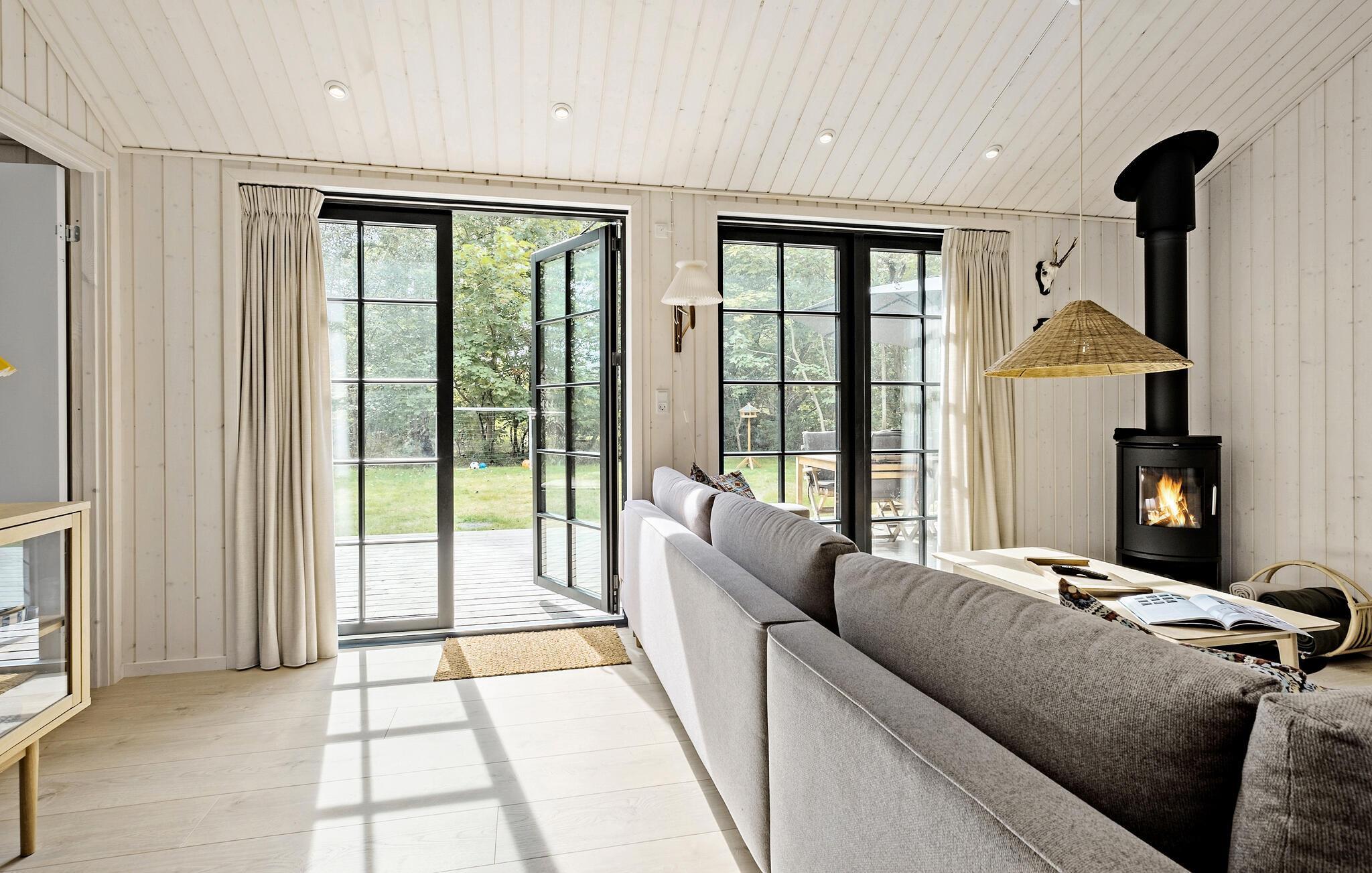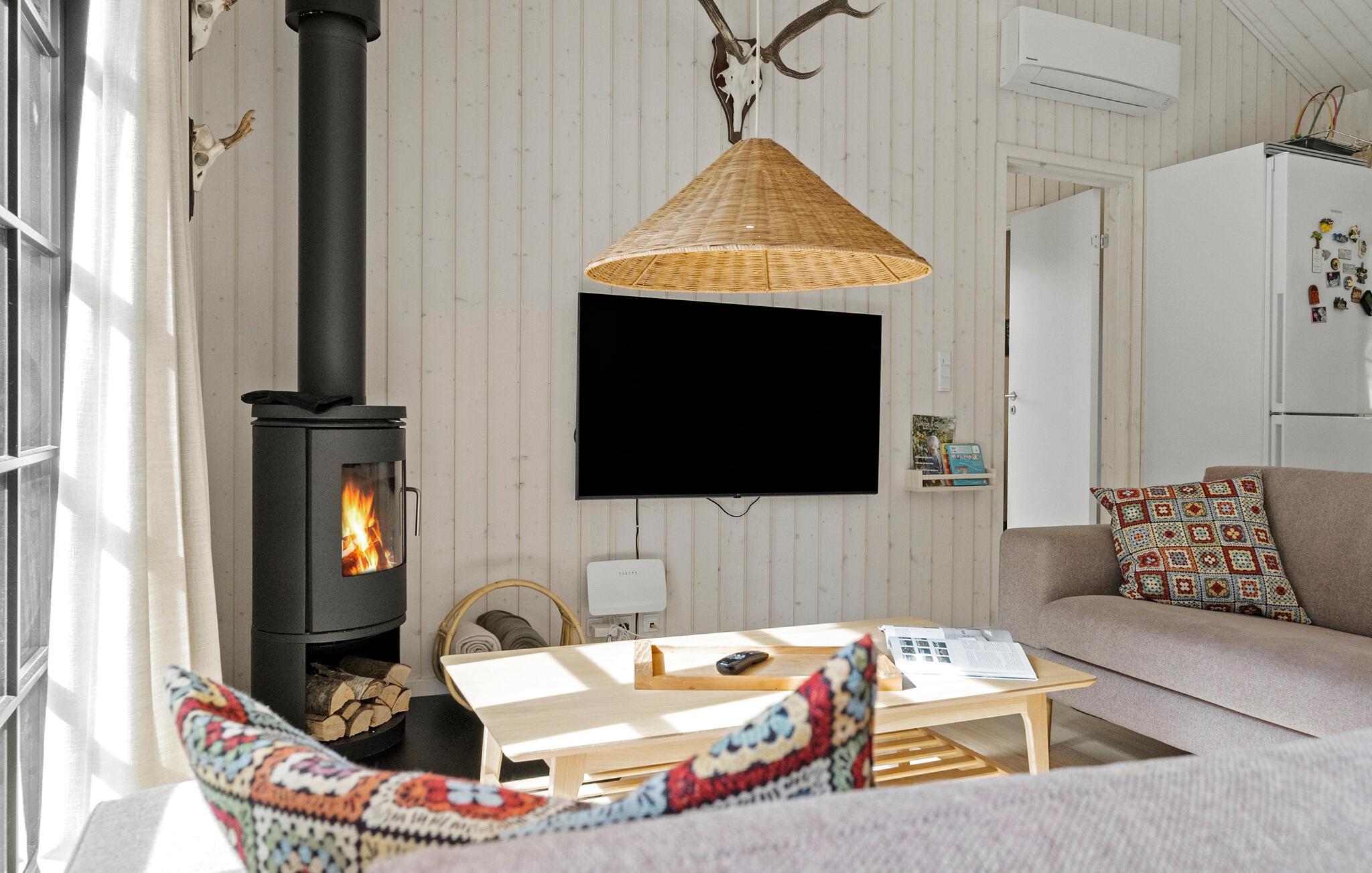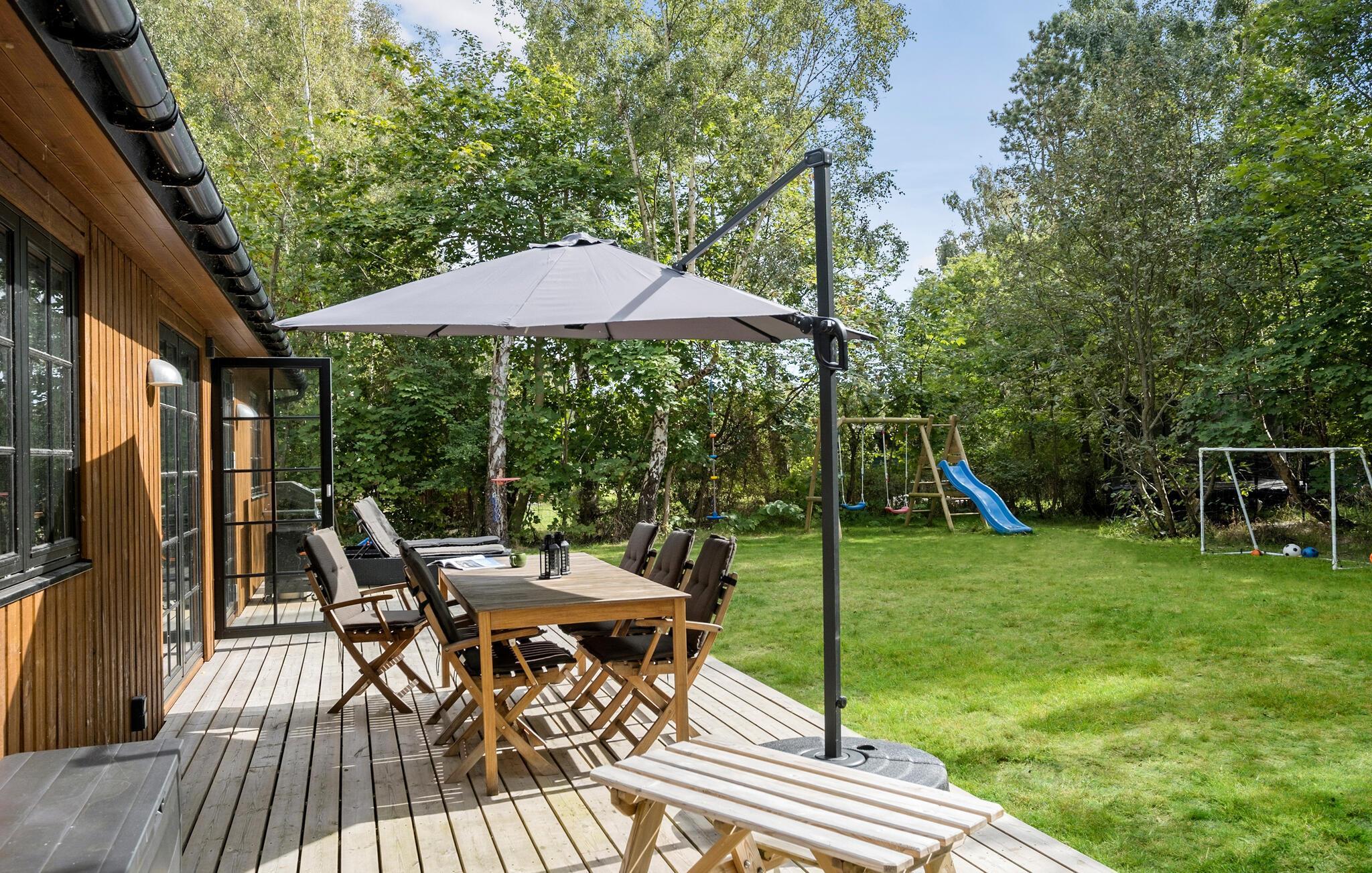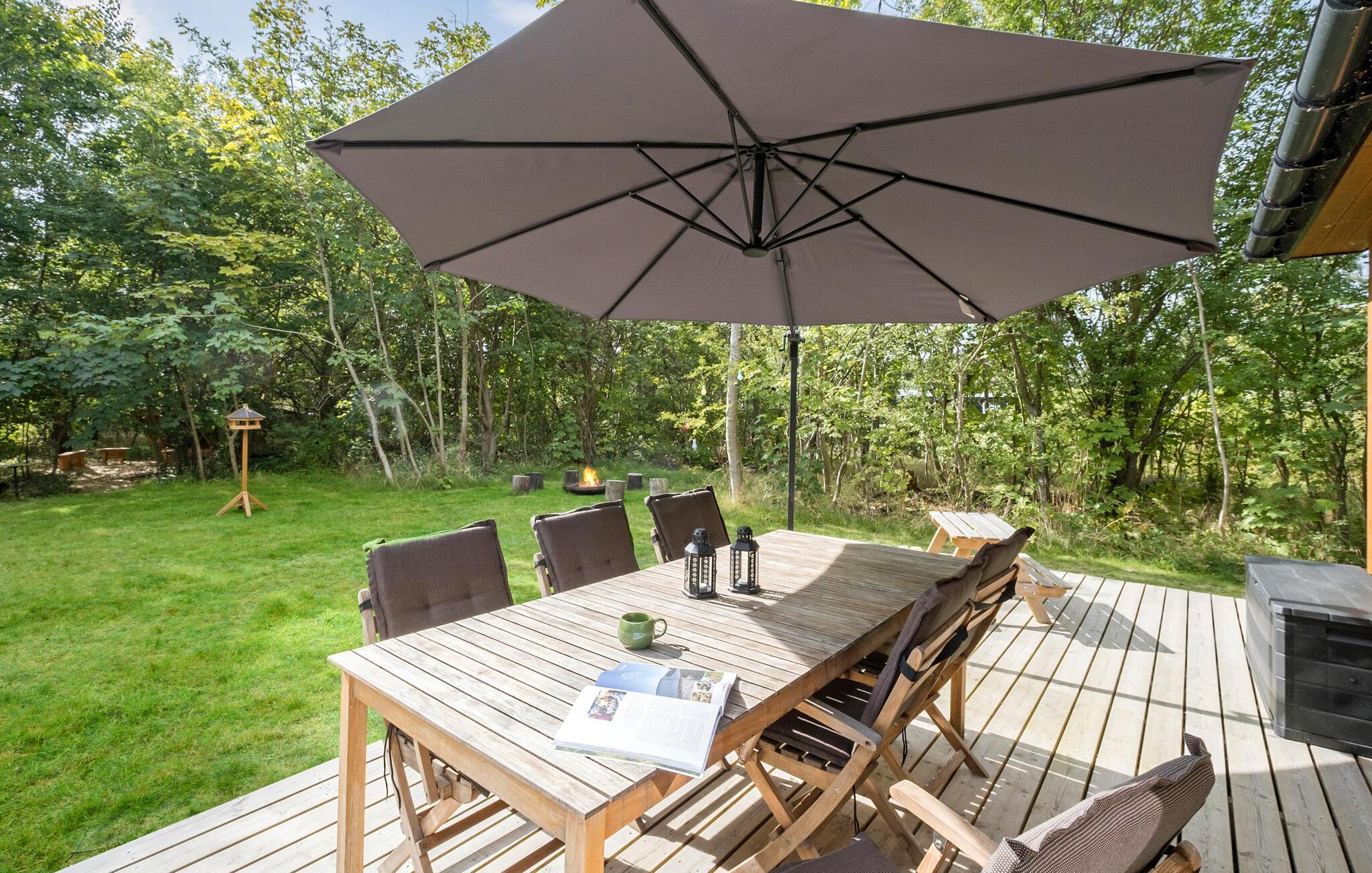 I dette moderne og hyggelige sommerhus med hems og åbent køkkenalrum. I sofahjørnet kan I tænde op i brændeovnen og slappe af efter en lang dag med ferieoplevelser. Aftensmaden kan I enten forberede i det veludstyrede køkken eller ude på grillen på terrassen. Herude kan spise under parasollen og nyde solen på liggestolende. Imens kan børnene hygge sig i haven med boldspil, gynge og rutchebane. I kan slutte aftenen af med skumfiduser eller pølser over bålfadet. Hvis vejret er til det, kan I redde op til at sove udenfor under træerne i shelteret.